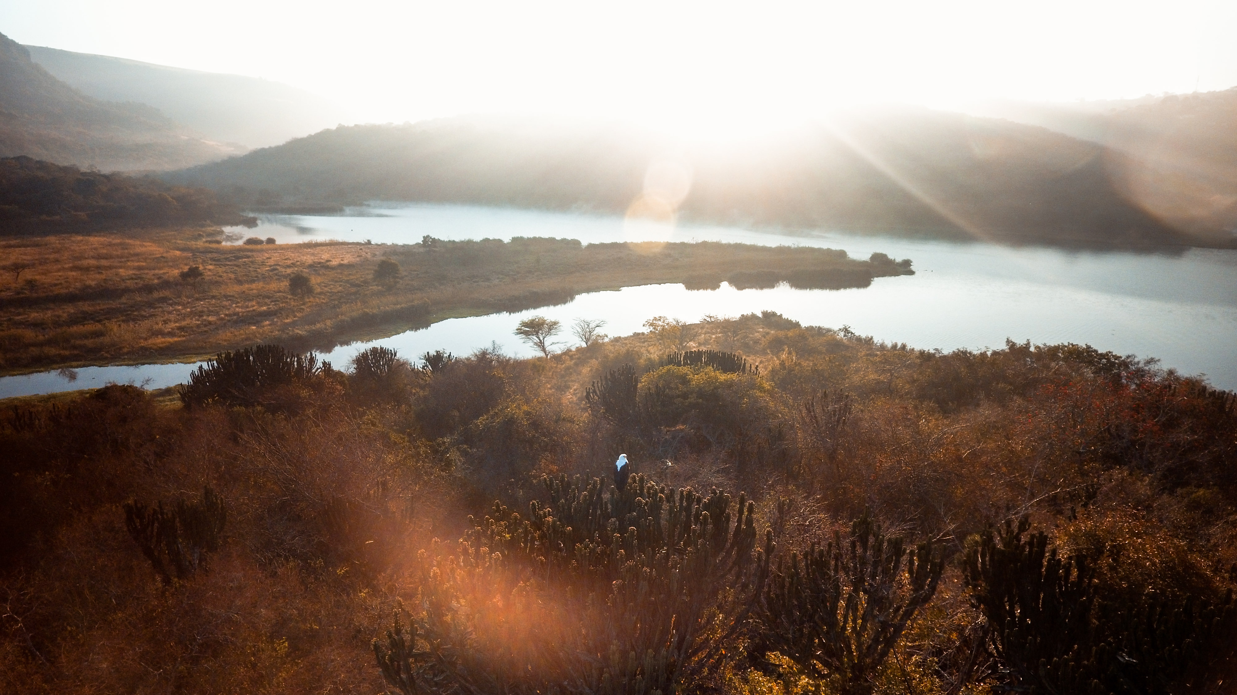 We Spotted a white object on the the other side of the dam sitting on the main tree placed on the top of the hill which we thought might be a fish eagle. So we decided to do a little bit of investigating with the drone to see if we were correct with our bird spotting skills. As we got closer to the bird of prey we were stoked to find out that we were right about our findings. We didn't want to get to close to this guy as we were in his house and wanted to respect the fact that he had even let us get this close without taking off or attacking us mid-air. He just sat there, not interested in us in the slightest.