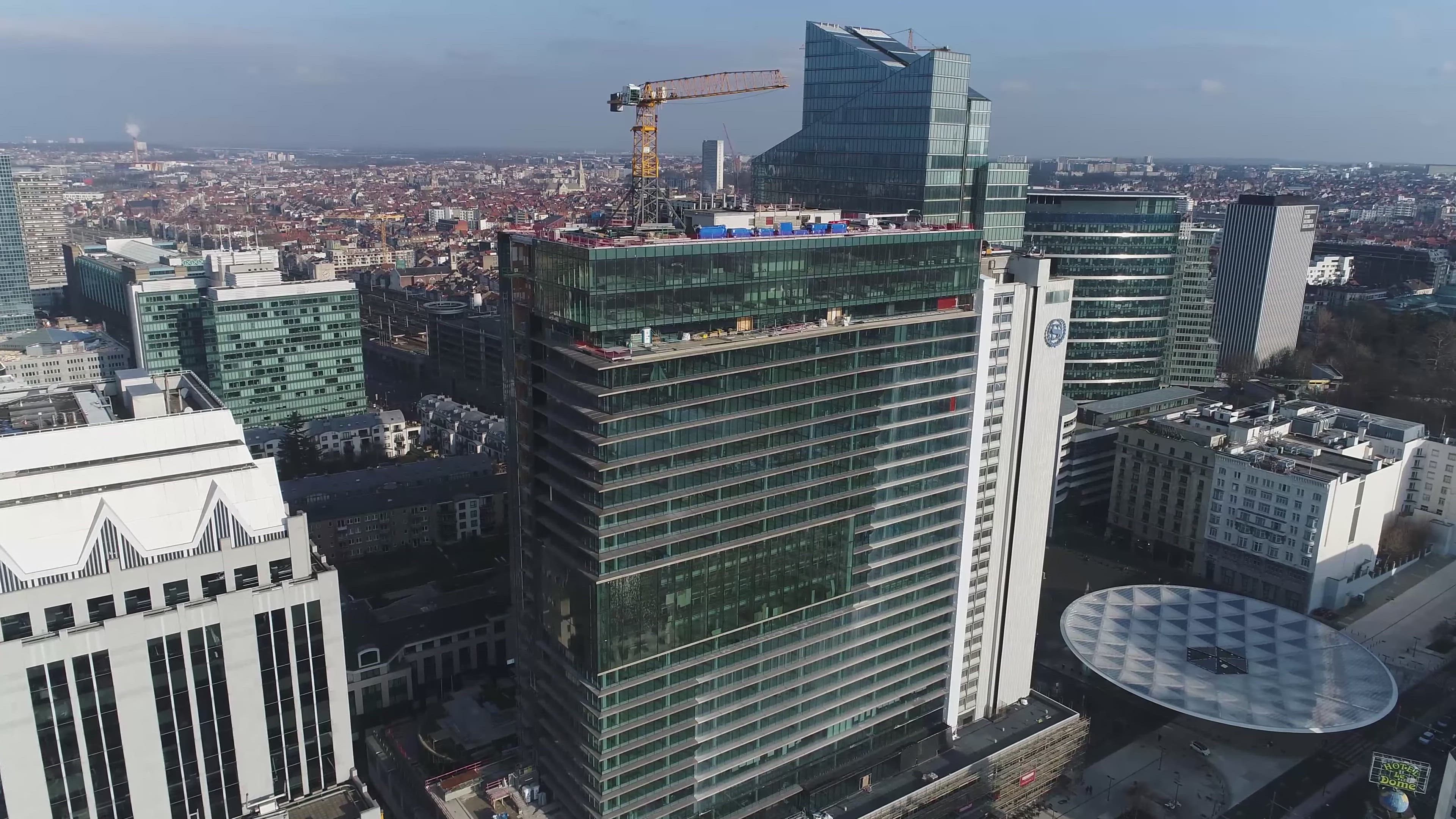Bird's eye view of the new constructions in the northern quarter of Brussels. Vue aérienne des nouvelles constructions du quartier nord de Bruxelles. Vogelperspectief van de nieuwe constructies in de noordwijk van Brussel. Music: Dvorák symphony No9