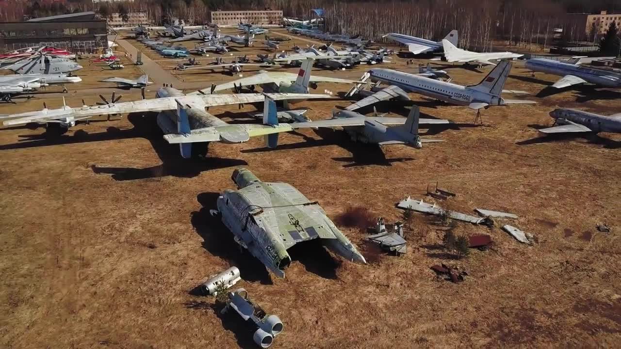During most of the Cold War years, the Soviet Union maintained the world's largest air force. At its peak in about 1980, the USSR had an active strength of 10,000 aircraft, significantly larger than the combined forces of NATO. With the dissolution of the Soviet Union and the end of the Cold War, many of these aircraft were simply abandoned in parks around the vast country. In this drone video by Drone Nest, you'll get a bird's eye view of one of these aircraft cemeteries in the Moscow Oblast.