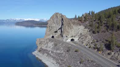 Aerial footage of Cave Rock on the shores of Lake Tahoe on the Nevada side.