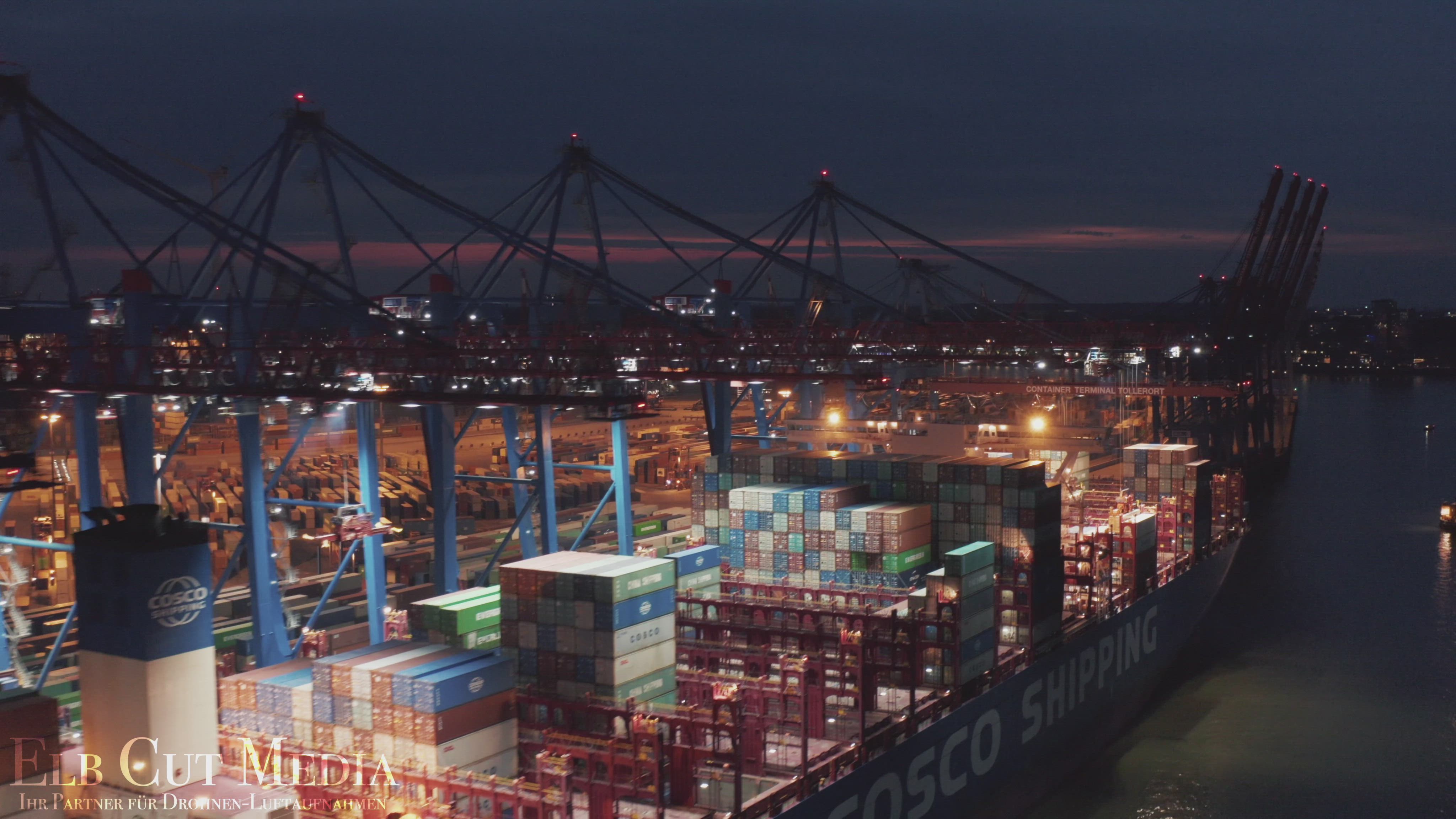 Nachtflug über ein Containerschiff im Hamburger Hafen