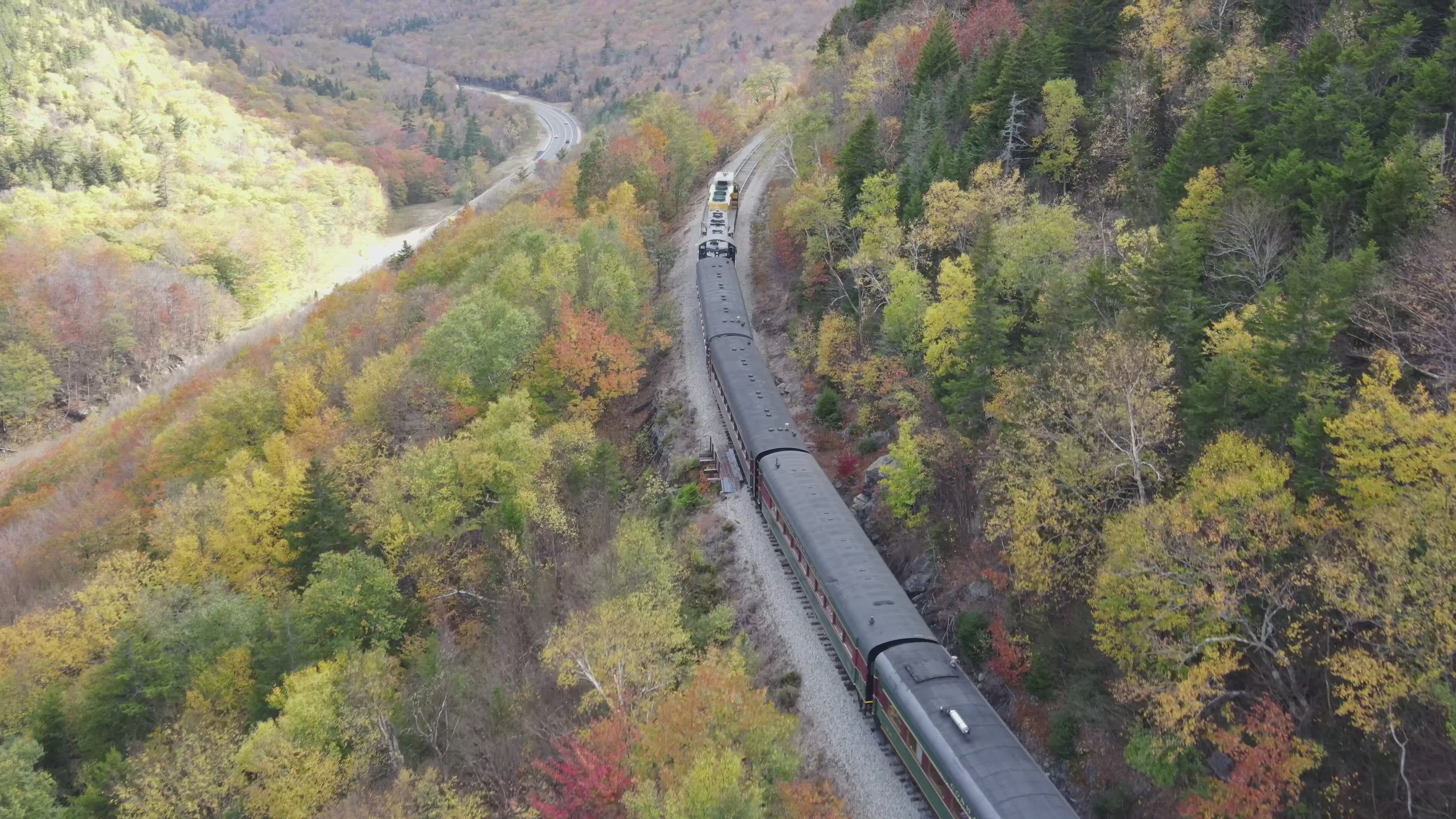 I saw the train coming through the Notch. Pulled into a parking lot, grabbed the drone, and let it fly. Lost the signal as it went behind the mountain, but it managed to RTH and even avoided some trees on the way back.