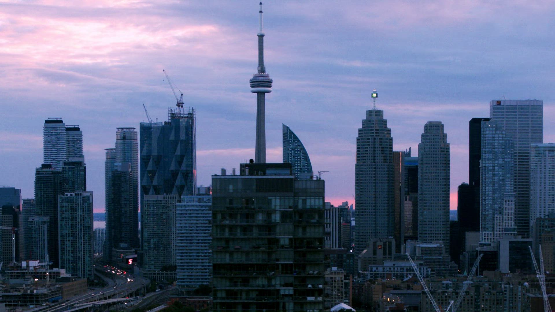 Aerial views of Toronto’s skyline from historic Corktown at sunset.