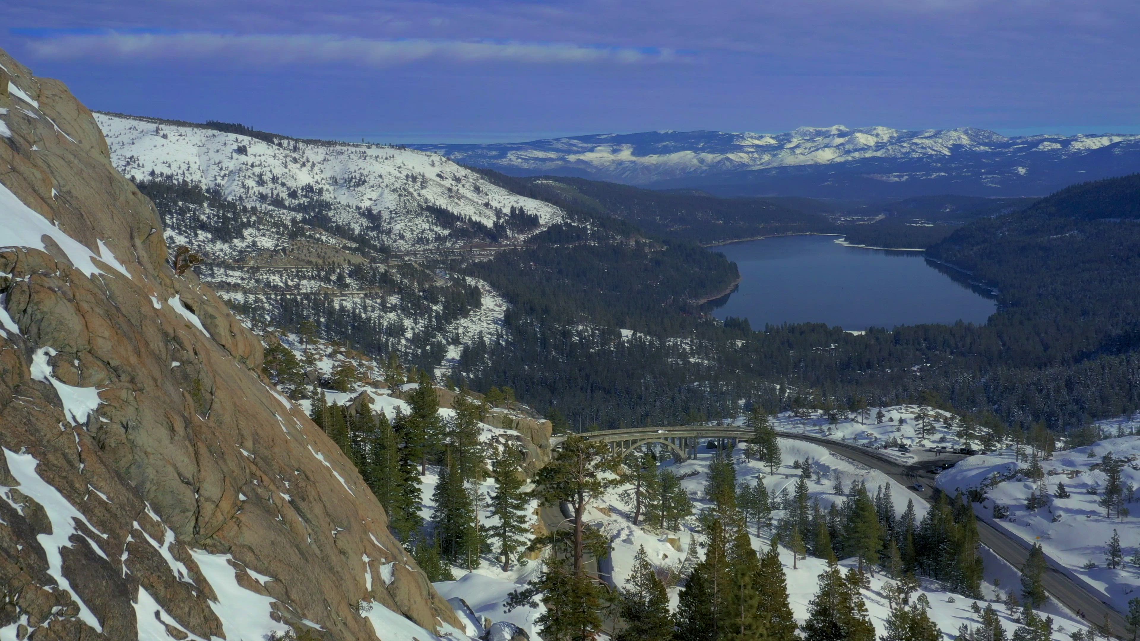 Donner Pass is one of the main passages through the USA's Sierra Nevada Mountains. Seen here in this drone video by cward360, the pass was used by the first Transcontinental Railroad, Interstate 80, and in between by virtually every other railroad and highway to San Francisco. It's named after an ill-fated group of 83 pioneers trying to reach California who were forced to spend the winter of 1846-47 here. Famously, the 45 members of the Donner Party who survived that terrible winter did so by consuming the remains of those who did not.