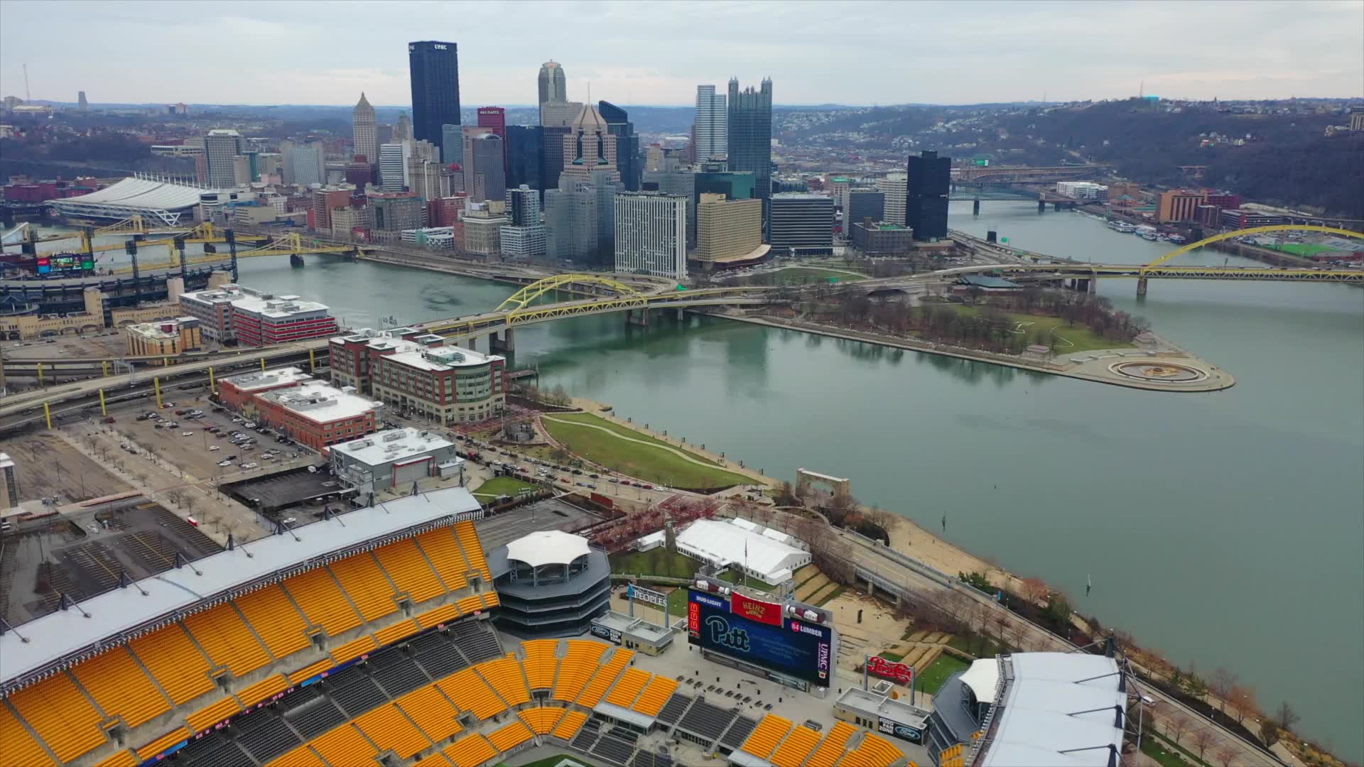 EdDrone's aerial mini-tour of Pittsburgh, Pennsylvania begins with one of its great landmarks - Heinz Field, the home of the 6x Super Bowl champion Pittsburgh Steelers. The stadium sits on the Ohio River, right at the point where the great river is born via the confluence of the Allegheny and Monongahela Rivers. From there you'll be taken over downtown Pittsburgh, which sits just to the east of Point State Park at the "triangle" formed by the three rivers.