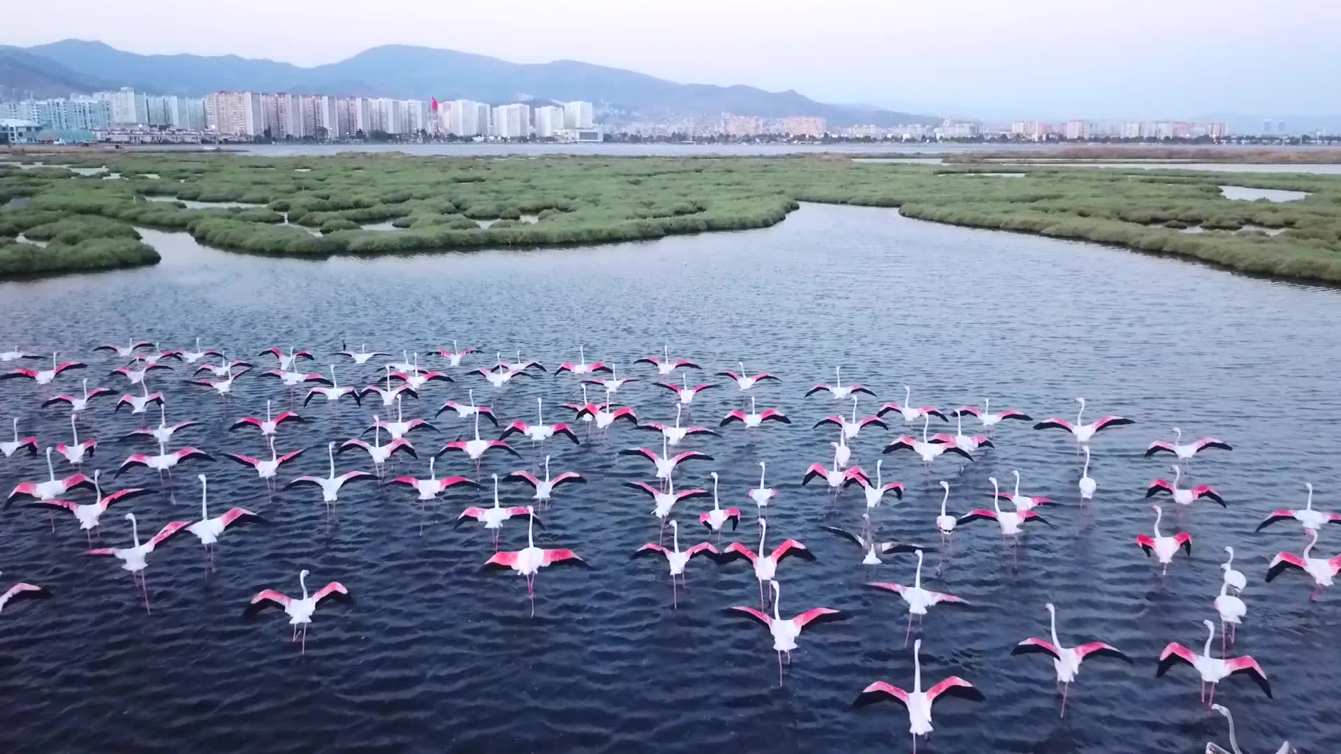 Flamingos near city. İzmir Turkey