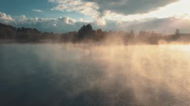 Flying backwards over a lake at sunrise with Mavic Pro (smoke on water)