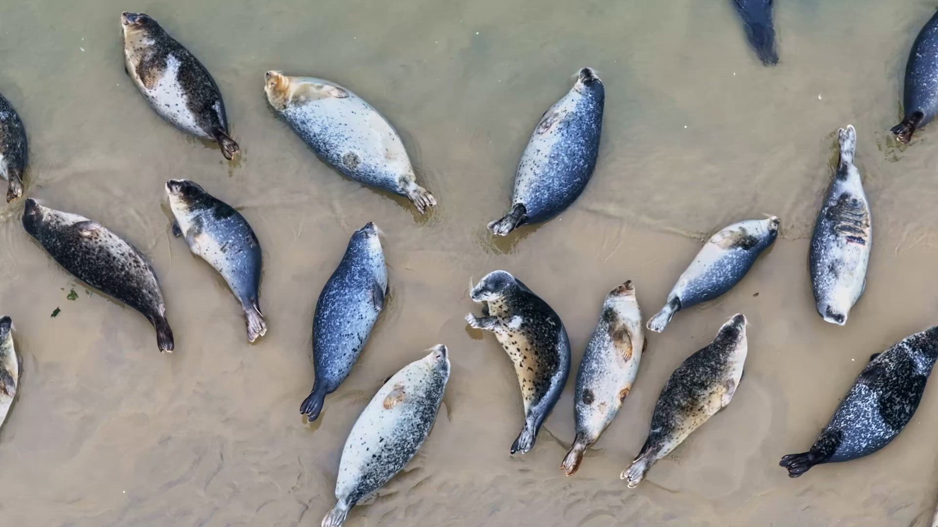 Harbor seals are showing up in great numbers to Moriches Bay, New York. Drone footage taken 1/13/25. Lined up here are 74 seals relaxing and taking a break at low tide on a sandbar. Diving in and out of the bay, slapping each other in the face and other antics were quite exciting to witness. This footage is taken with a zoom lens, as you should always keep at least 150ft distance from these beautiful creatures.