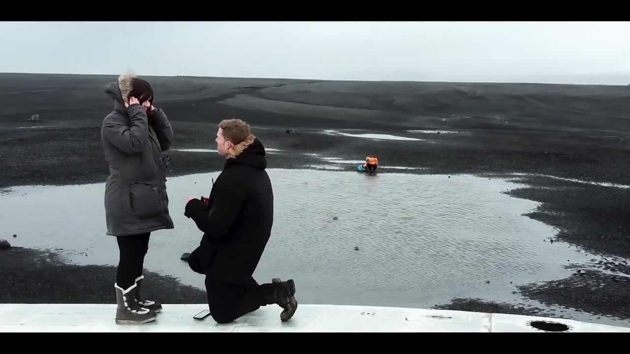 AIRVŪZ STAFF NOTE : Romance comes in many forms and this drone proposal shows that a more offbeat approach can be unforgettable. Atop plane wreckage in a dramatic Icelandic landscape, the man gets down on one knee and surprises his bundled beloved with a ring — and it's all seen from an aerial view. Who wouldn't say "yes" to that?