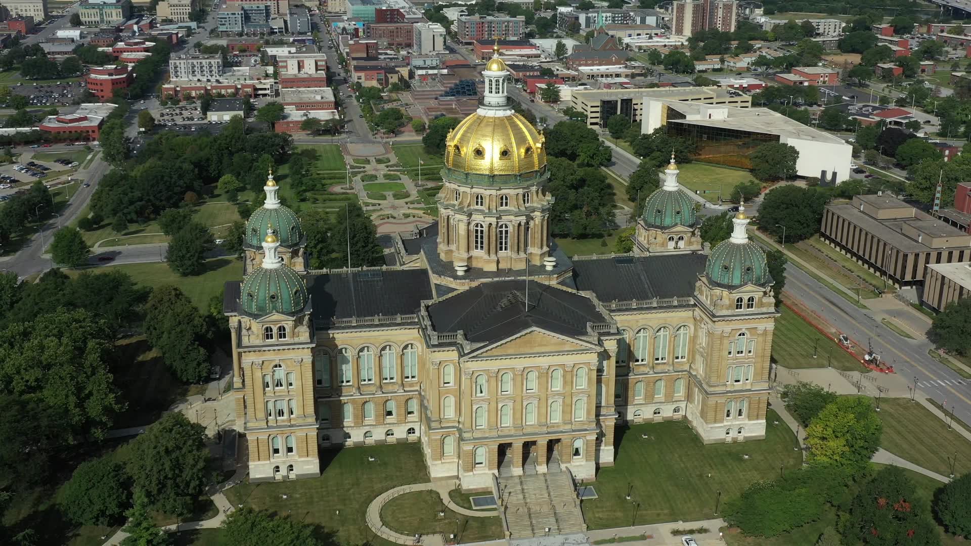 Here's an awesome aerial view of the Iowa State Capitol Building in Des Moines. Des Moines was the site of a small fortress and wasn't incorporated until 1857, in connection with the adoption of a state constitutional amendment moving the capital from Iowa City to a more central location. Construction of the Capitol began in 1871 and took 15 years to complete. It houses the legislature as well as the top executive offices of the Hawkeye State. It's known as the USA's only five-domed capitol.