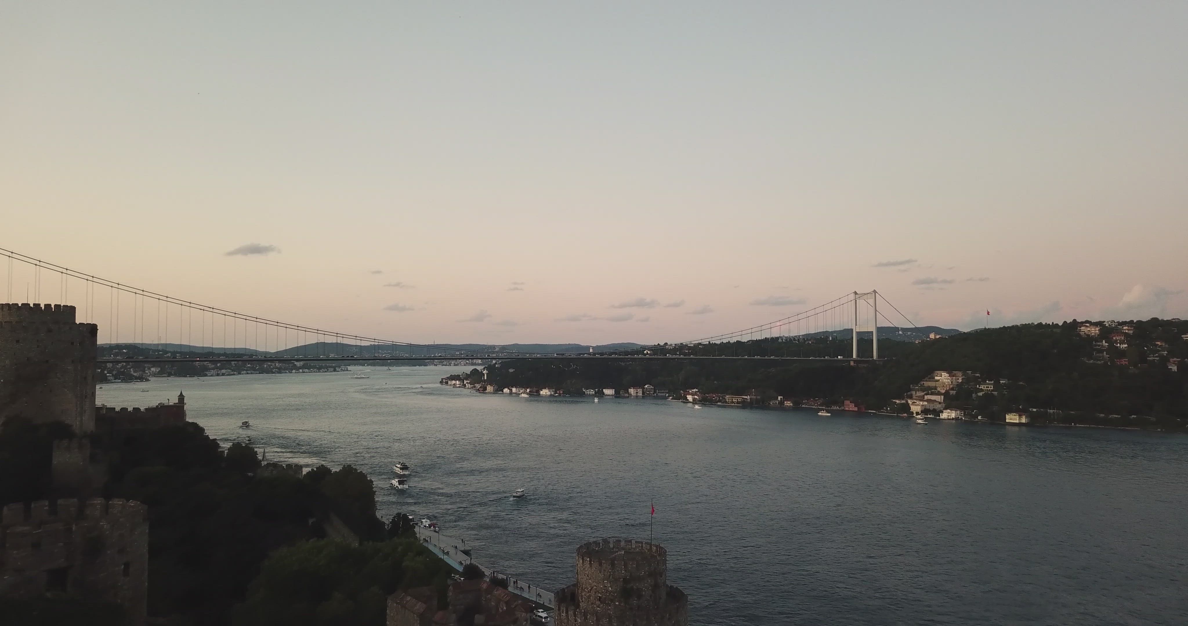 Drone flight at sunset across the Bosphorus in Istanbul which connects Europe to Asia. Video was taken with Mavic Pro in August 2019 then editted using Adobe Premiere Pro. Featured in this video are Rumeli & Anadolu Hisar, where were used by Mehmet the Conqueror to capture the city. Anadolu Hisar is the first fort in the video, and Rumeli Hisar is shown in the middle of the video. The bridge in this video is Fatih Sultan Mehmet Bridge. You can also see a panoramic video of European side of the city.