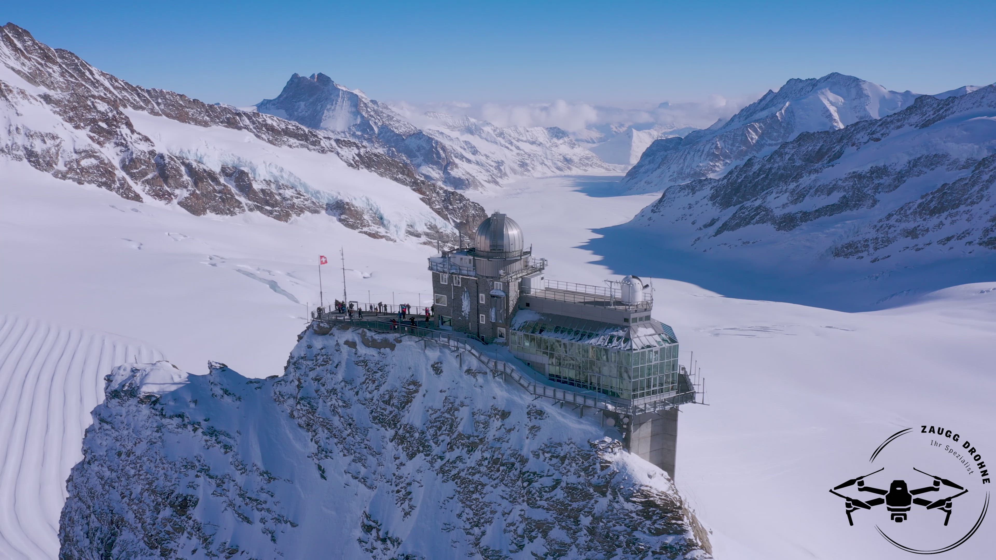 The highlight of every Swiss trip: Jungfraujoch – Top of Europe. Surrounded by glaciers and eternal snow. Observation deck with fantastic panorama. produced by www.zaugg-drohne.ch