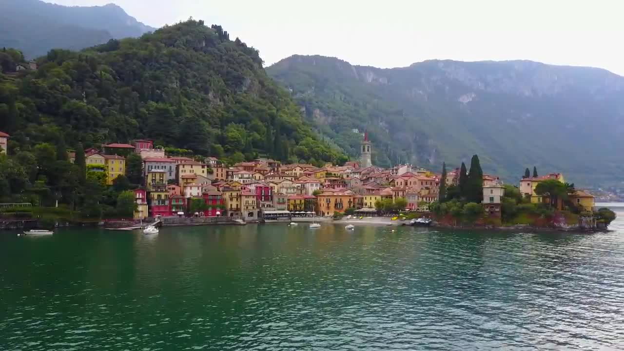 Varenna Italy, rustic town on the east side of lake Como. Aerial cruise down the scenic shoreline.
