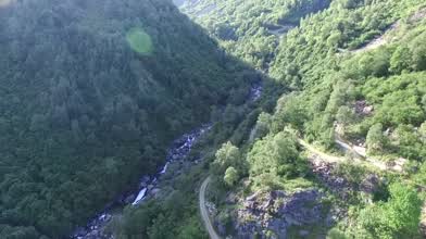 In flight over the river next to an ancient building of the friars in the Biella pre-Alps in Italy.