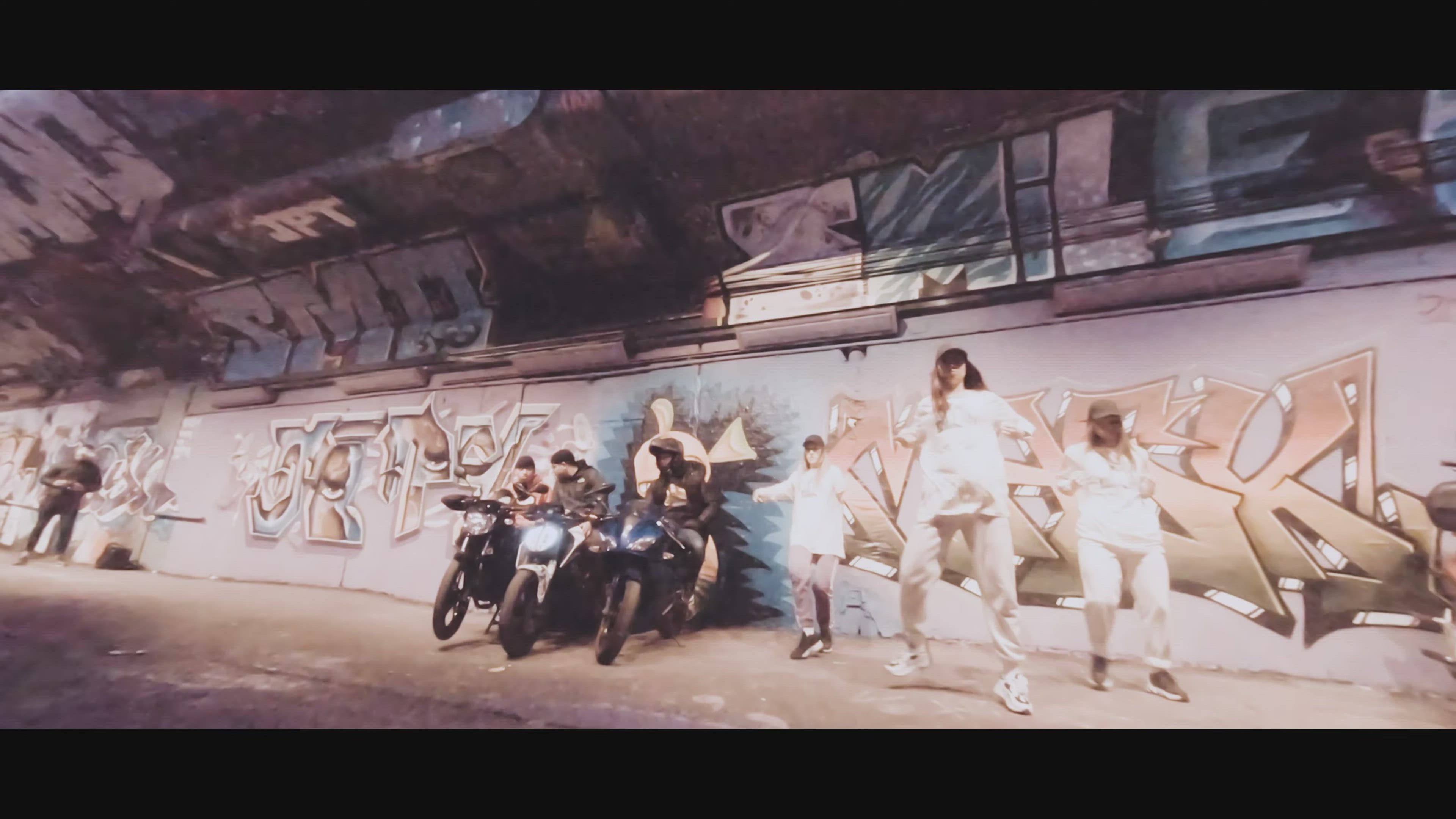 bikers and dancers in graffiti tunnel, London