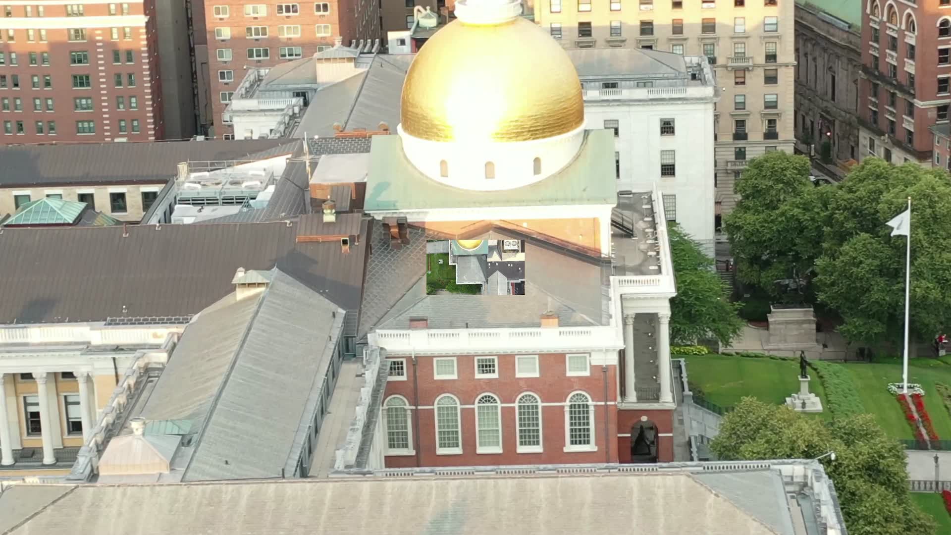The gold domed building is the Massachusetts State House in Boston. If you saw the movie the Departed, this building is what is visible out of Colin Sullivan's (Matt Damon) apartment. The "apartment" is actually the Suffolk University Law School, which you can also see in the video - it's the white building directly across the from the state house.