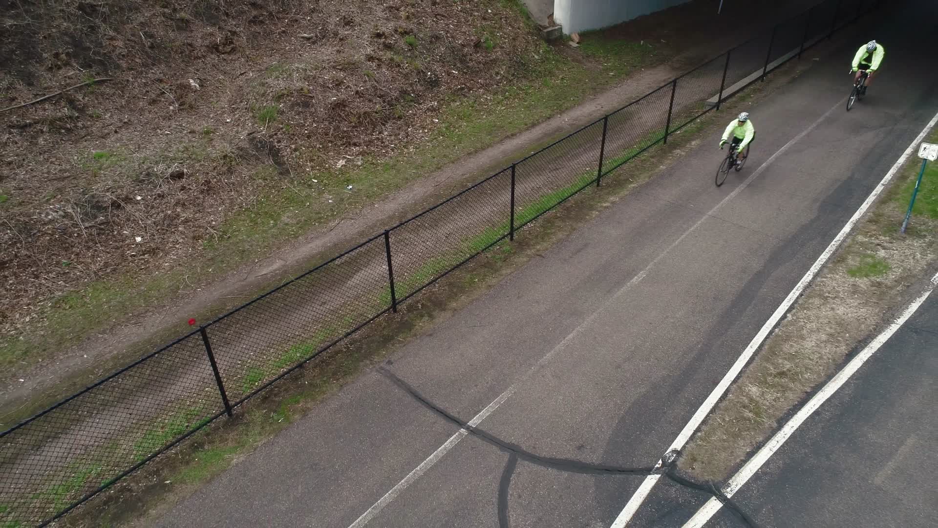 An aerial view of a section of the Midtown Greenway bike path that runs through Minneapolis. This portion was filmed in the Uptown area of the city.