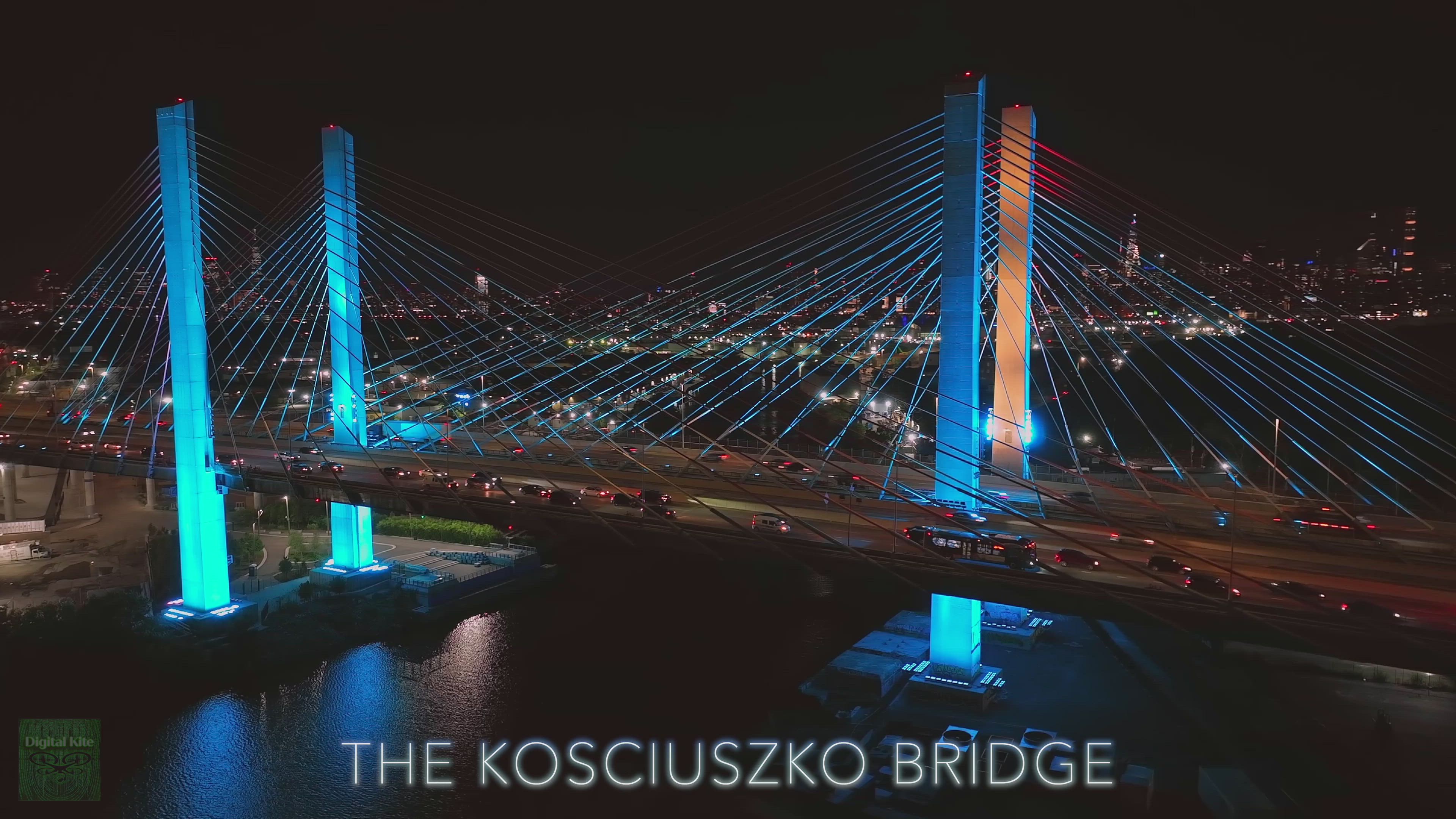 The Kosciuszko Bridge /ˌkɒziˈʊskoʊ, ˌkɒʒiˈʊʃkoʊ/ New York City's 1st cable stayed bridge which crosses Newtown Creek. Like & SUBSCRIBE! The bridge connects Greenpoint, Brooklyn to Maspeth, Queens, it officially opened in 2019. It has an incredible LED lightshow which can be synchronized to music! Enjoy the show captured with a Mavic 3 Cine with an unexpected tugboat pushing a barge of sand at the end in the dark.