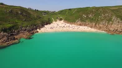 The beautiful azure waters of Porthcurno and Pedn Vounder beaches in Cornwall in the South West of the UK
