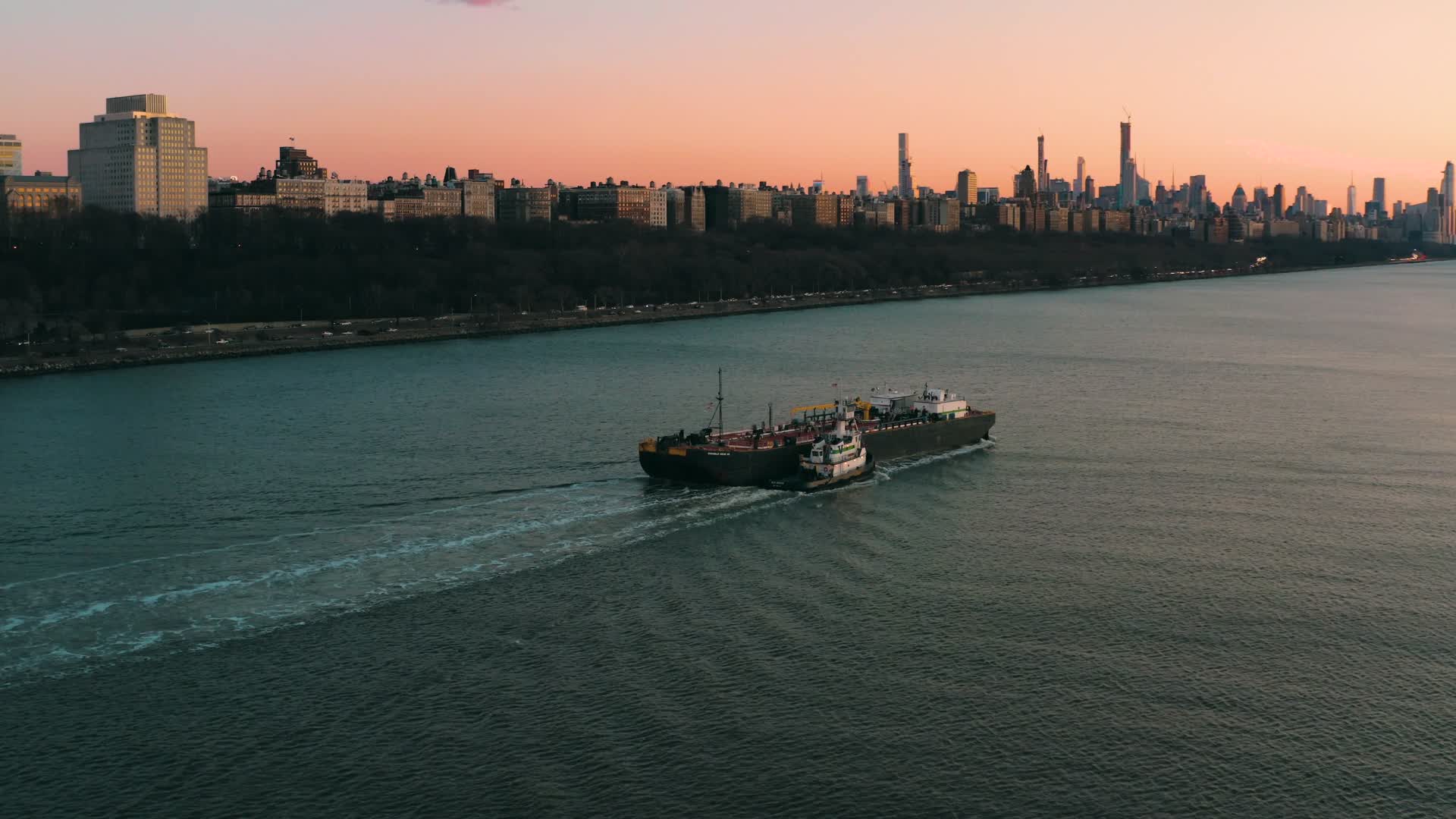 Berco_aerial created this awesome drone video of a cargo ship being pushed down the Hudson River in New York City. Shot at sunset, the video will give you a great look at the West Side of Manhattan. The part of the island closest to the shooting location is Riverside Park, which runs for about 6.5 km (around 4 mi.) down the length of Manhattan, between the river and Riverside Drive. The video looks south towards the skyscrapers of Midtown on the West Side and beyond that to those of Lower Manhattan.