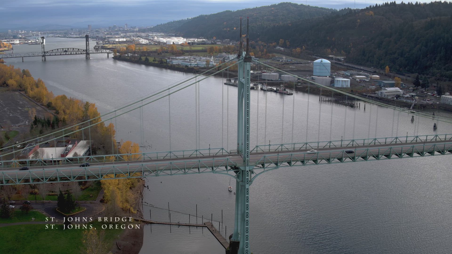 Portland, Oregon is sometimes known as Bridge City due to the numbers of spans over the Williamette River, which runs through the heart of the city. In this drone video by AirVuz contributor whtmagic, you'll get an aerial view of St. Johns Bridge, which is the northernmost of the eleven spans. Opened in 1931, the bridge has a total length of just under 2.1k ft. (630 m). The only Portland bridge with a suspension design, it also has the distinction of being the tallest, with tower heights of 400 ft. (120 m).