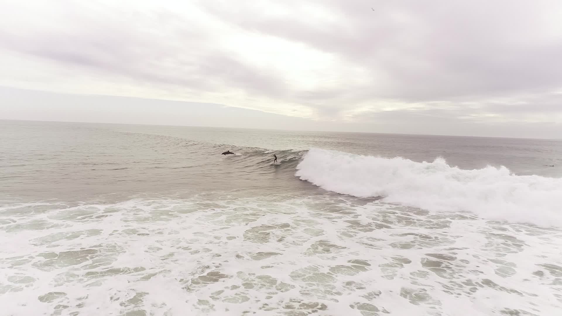 I took off from the sidewalk and flew out towards the waves and noticed a surfer dropping in so I focused on him and then the dolphin's started popping up.
