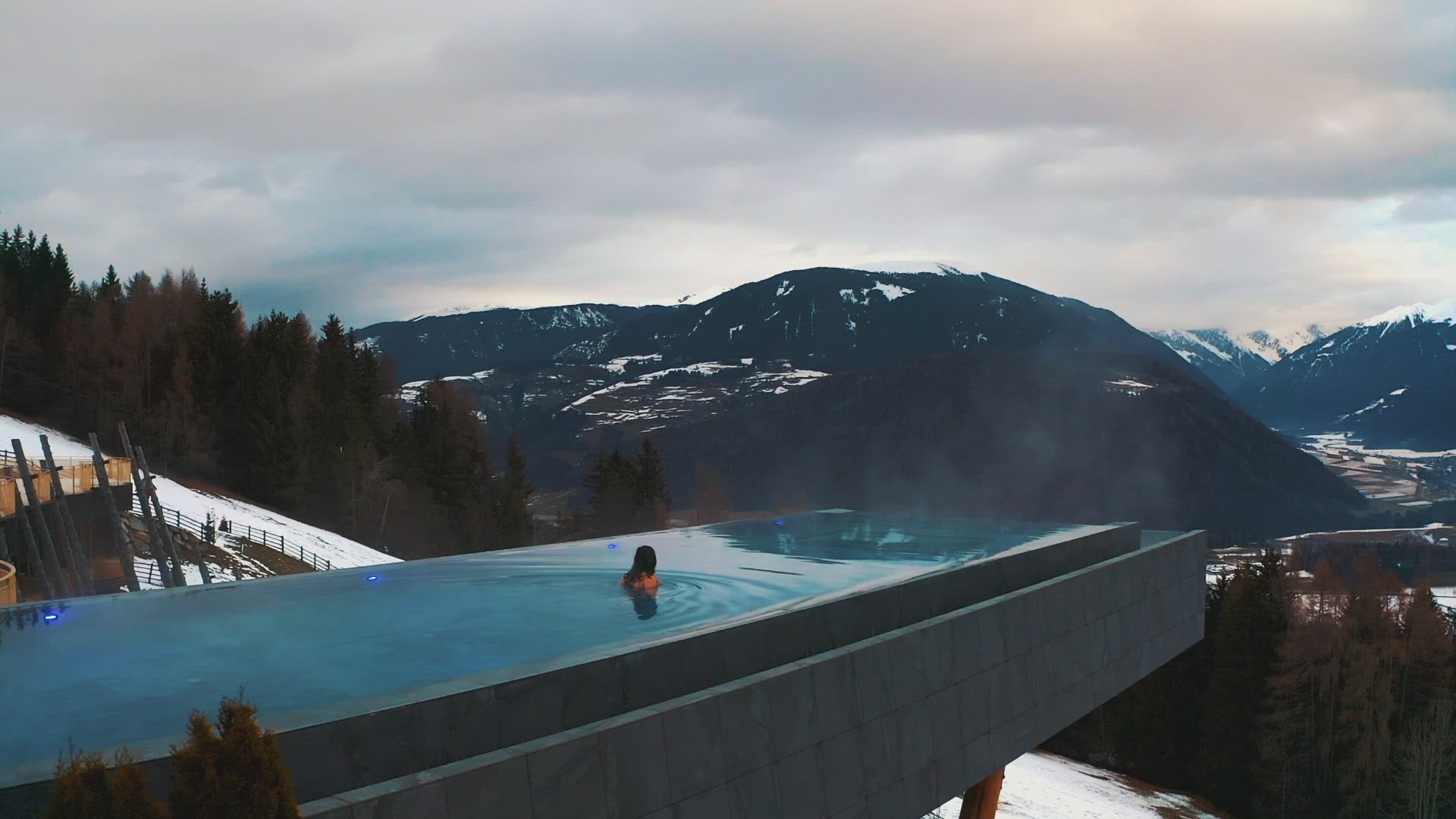 A day at the Infinity pool on the Alps of Trentino Alto Adige (Italy) with amazing view.