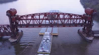 Aerial over a barge on the Mississippi.