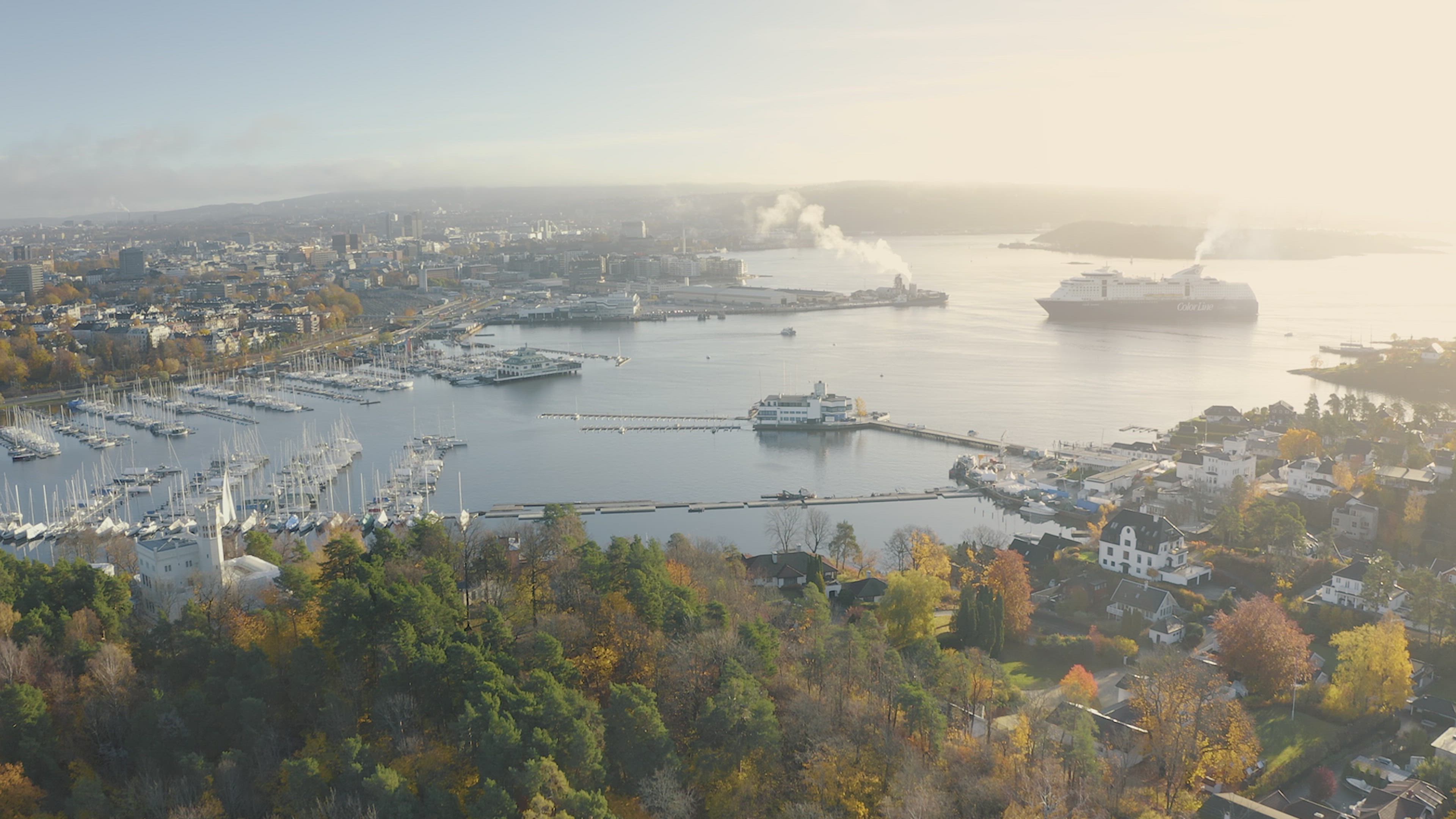 The stunning views of the Oslo Fjord and the city in the distance on a cold autumn morning with the sun rising. Filmed on a peninsula outside of Oslo called Bygdoy.
