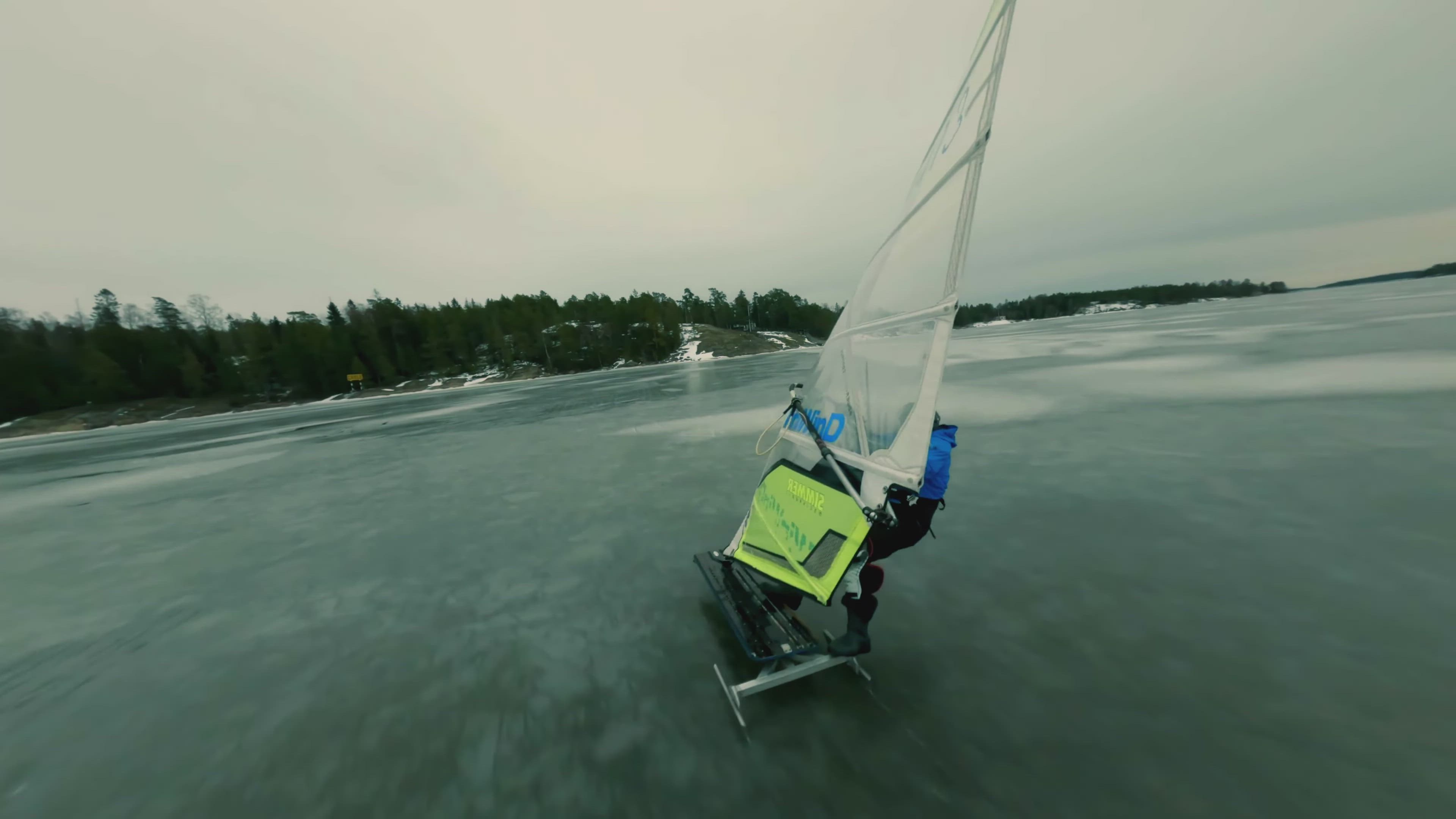 We went out about 3.8km from the beach to reach a spot with black ice, because the white on got too soft already for our ice sleds. Then we took some drone shots with one of my FPV drones of Esa jibing back and forth. It was kind of epic to fly there.