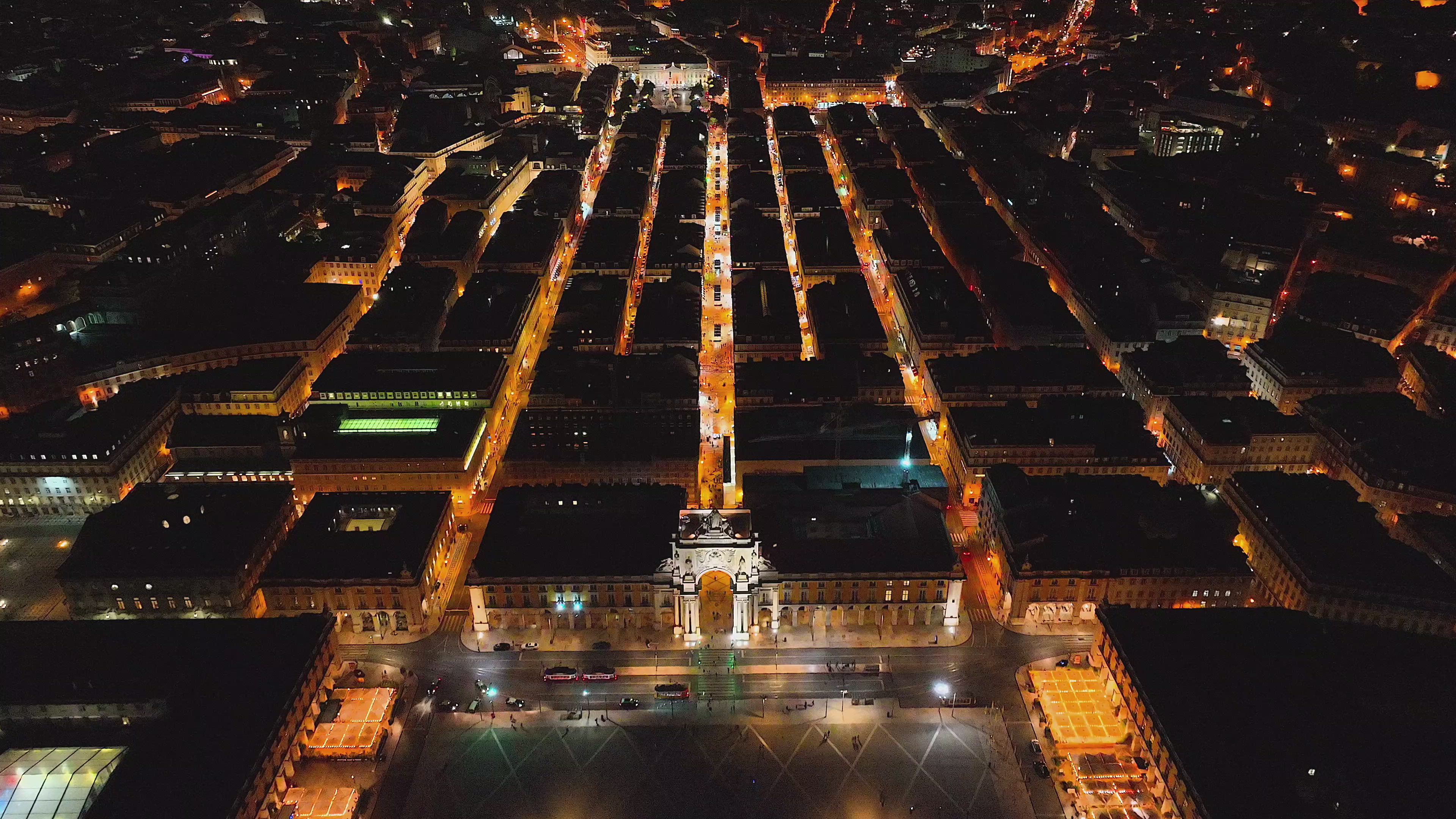 Flight over the old town of Lisbon at night
