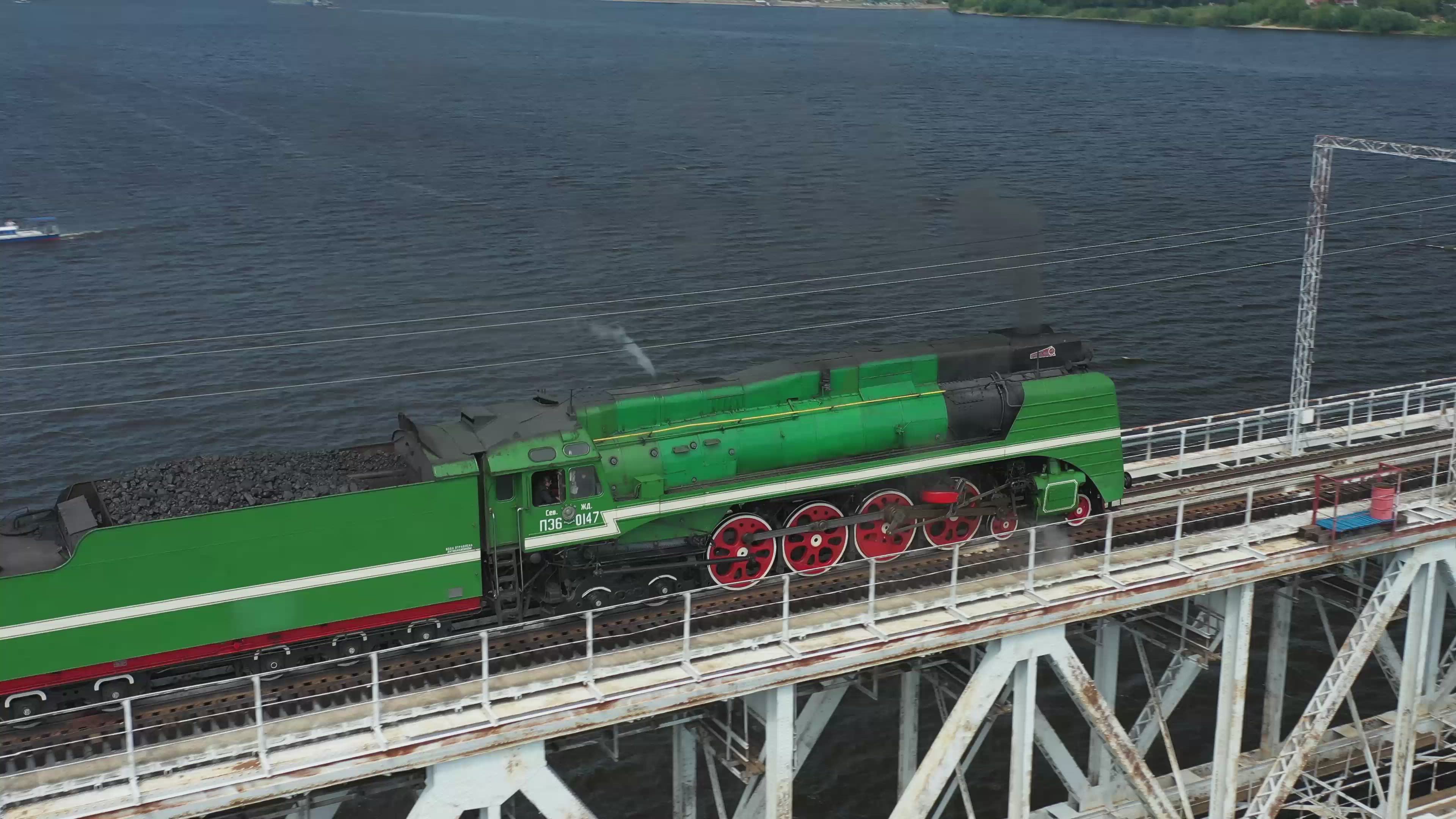 retro train on the bridge over the Volga