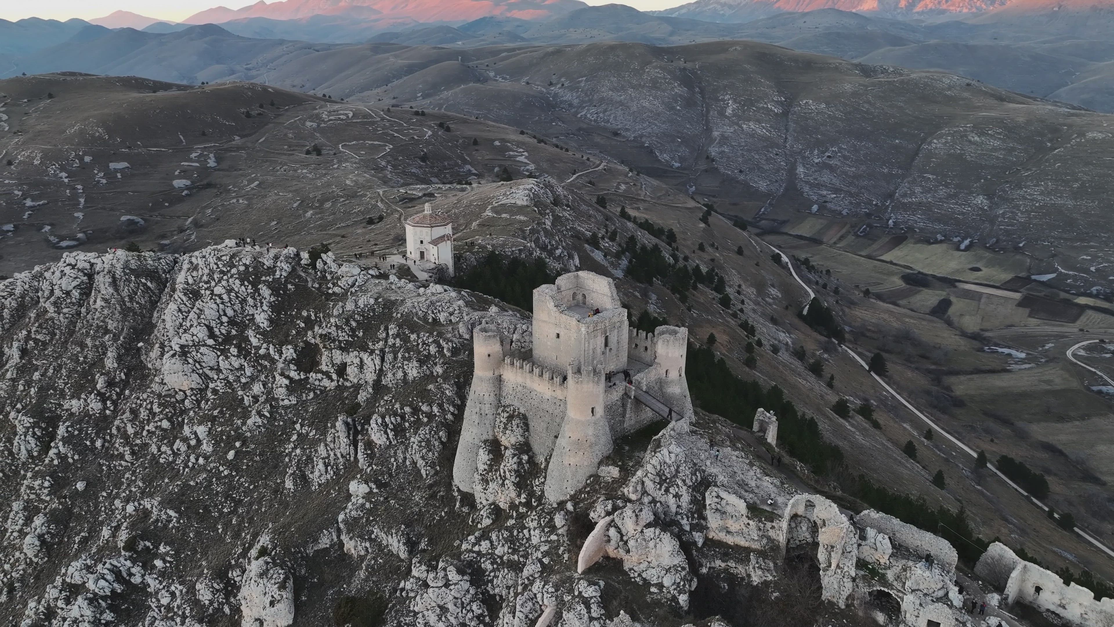 AirVuz contributor Damiano862 brings us this marvelous aerial view of a famous medieval fortress in Italy called Rocca Calascio. Originally built in the 10th century AD, the fortification occupies a key location in the Apennines Mountains in the Abruzzo region in the west-central part of the country. The highest of the Appenine fortresses, it sits at an elevation of about 4.8k ft. above sea level or around 1.5k m. It's been used as a filming locations for several movies, notably The Name of the Rose (1986) and The American (2010).