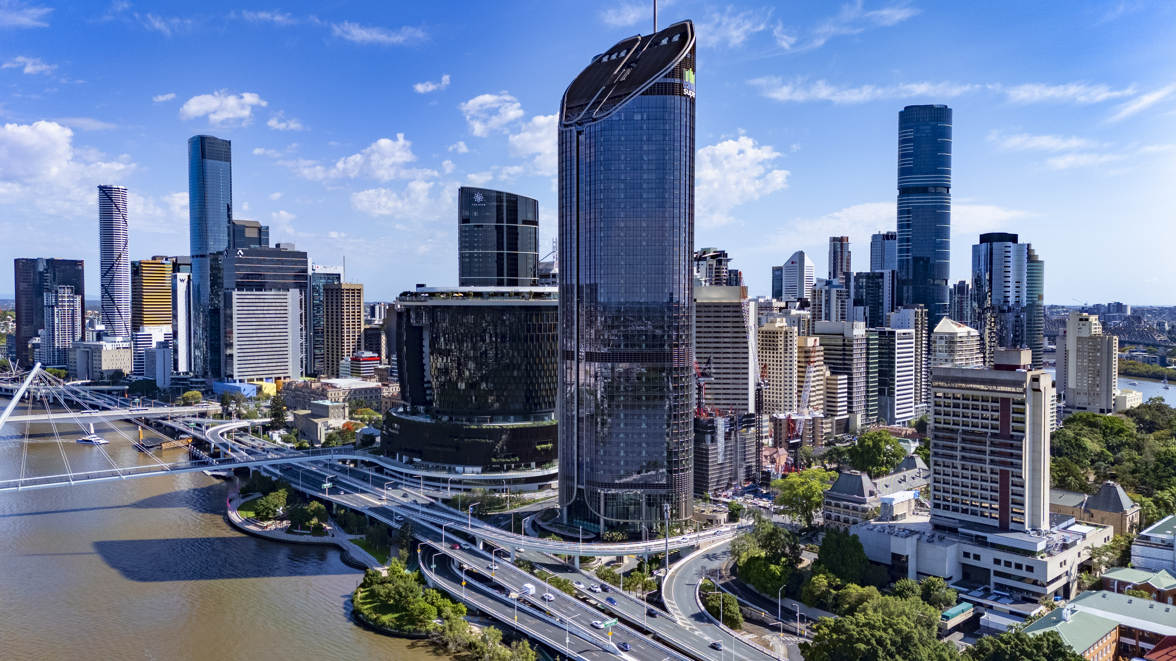 Aerial view of Brisbane city skyline.