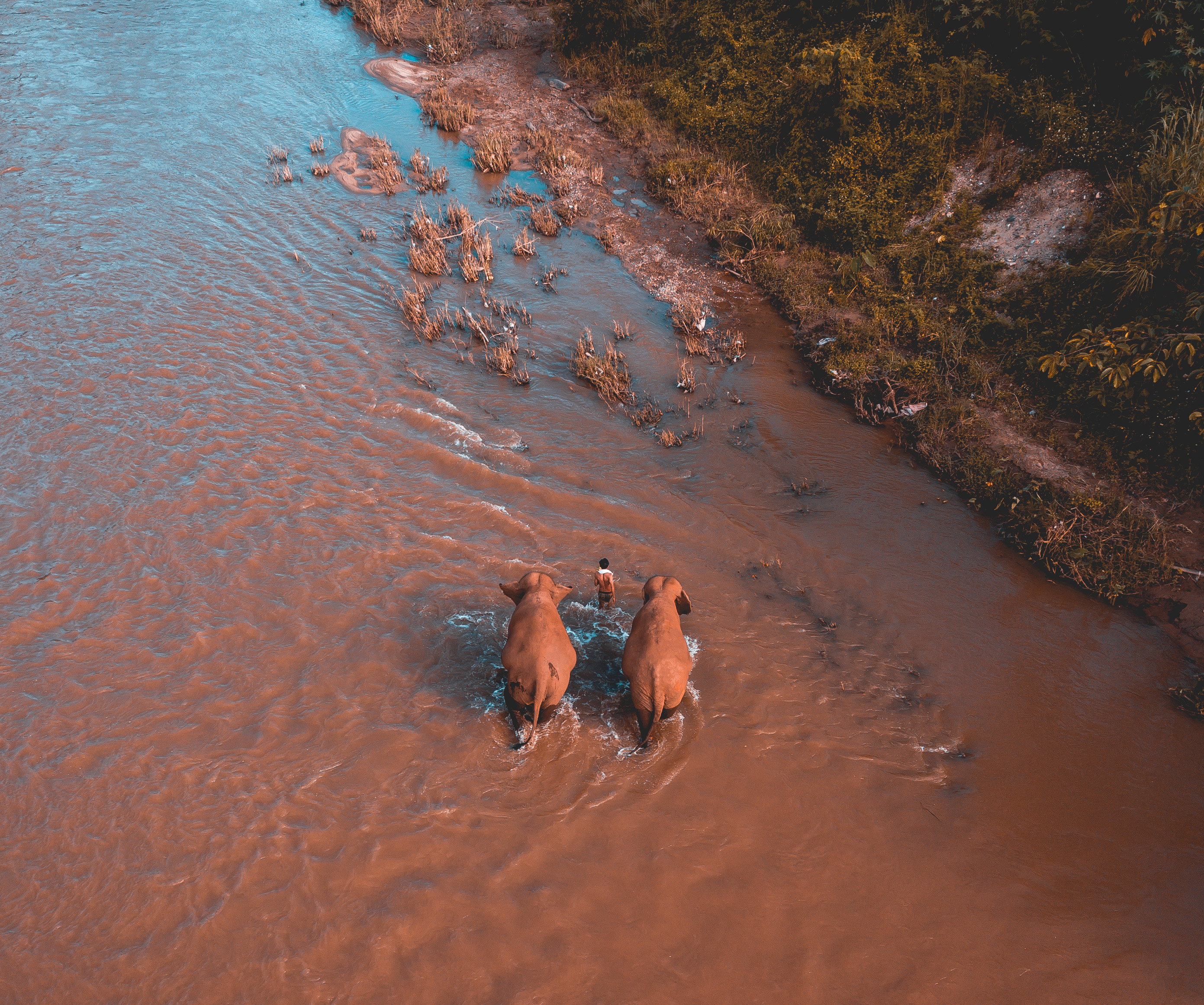 Captured this aerial of a man walking with his elephants through the river.
