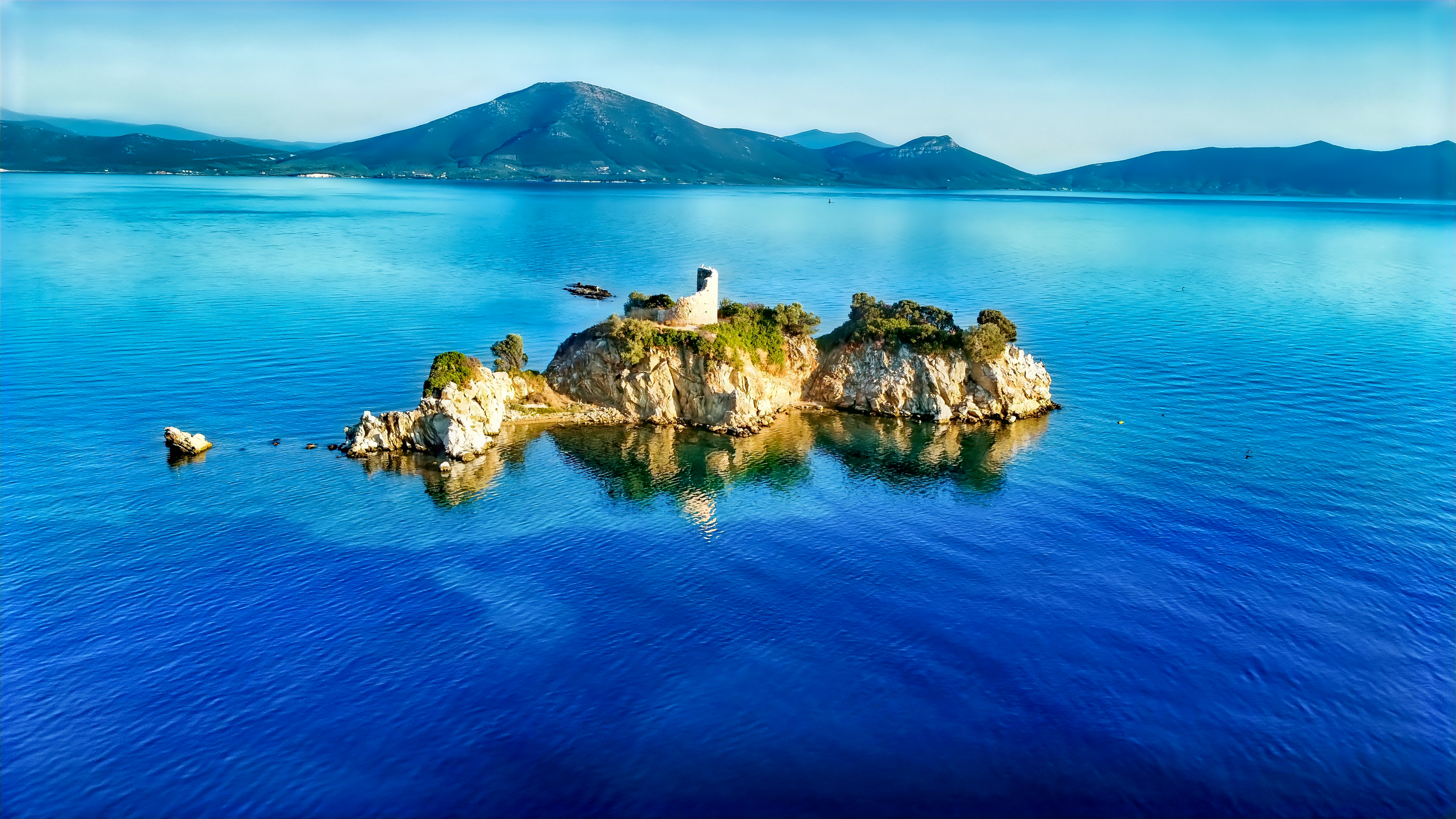 Rocky island Monastiri reflects its sunny side in Aegean crystal blue water.