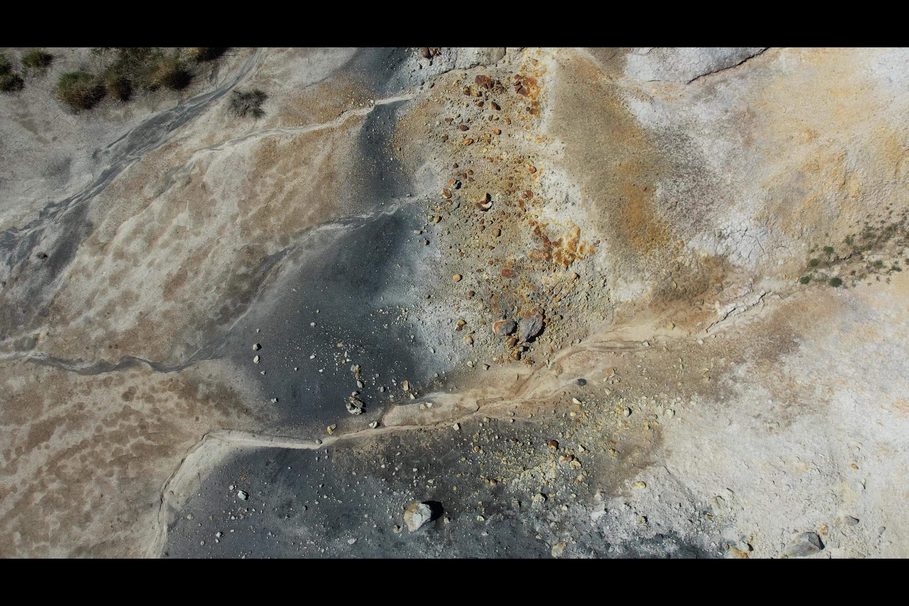 Fotografía tomada con un dron Autel Evo II Pro sobre sedimentos áridos de una antigua cantera, a la orilla del embalse de Ebro.