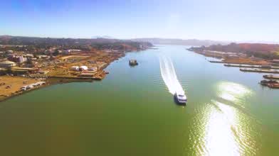 Aerial Video, following the SF Ferry as it approaches Vallejo, California