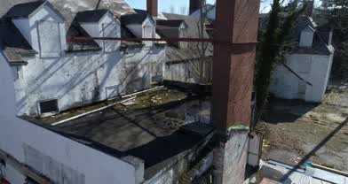 Aerial pan and tracking shot of old dilapidated hotel in the Hamptons