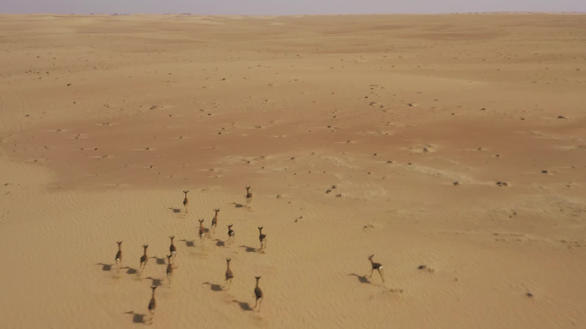 A herd of beautiful Arabian gazelles and a Jeep Wrangler roaming the picturesque desert dunes of Dubai, UAE. Shot on DJI Mavic 2 Pro and PolarPro Vivid Collection ND Filters