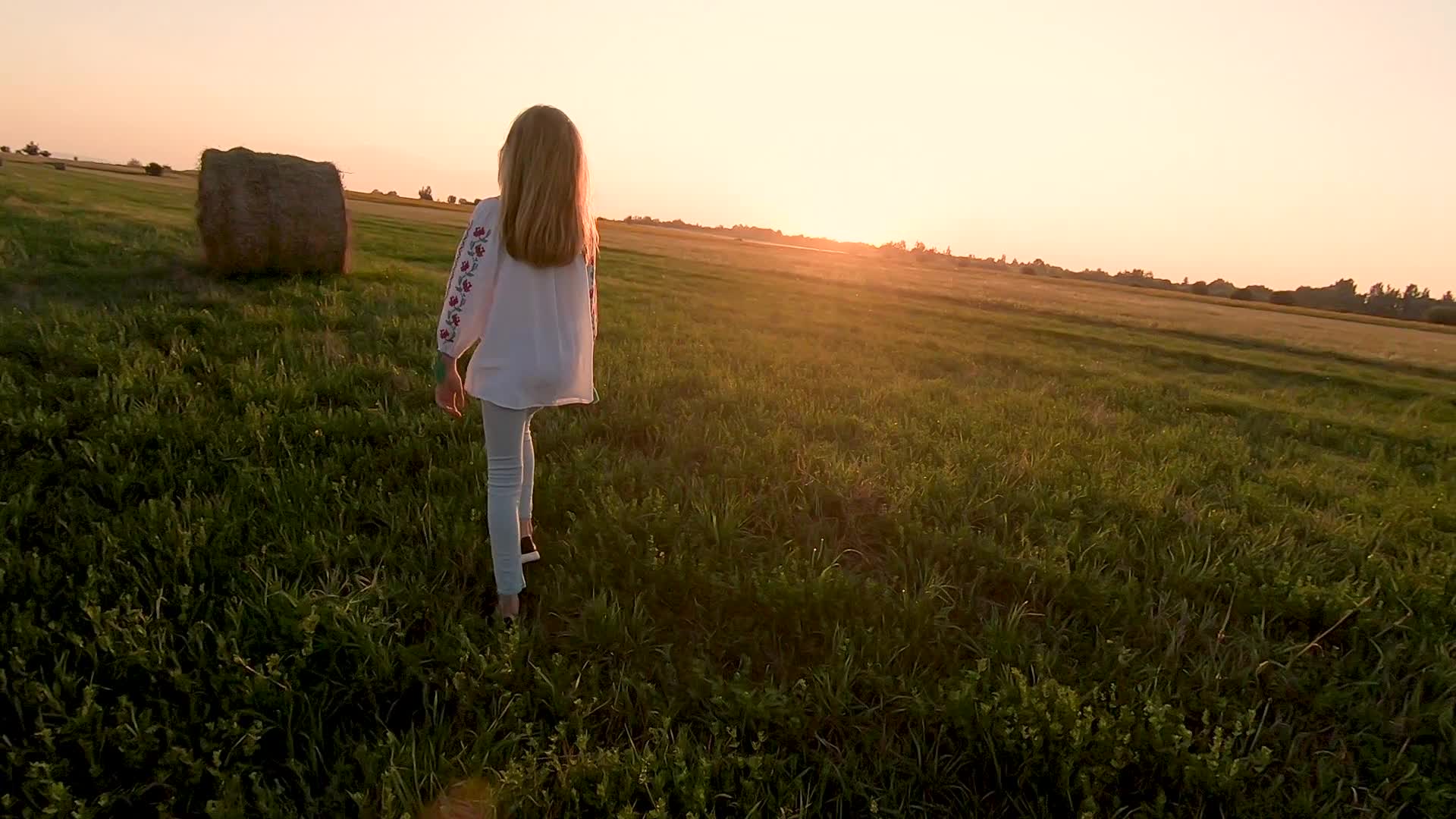 Young girl running free in a harvested wheat field