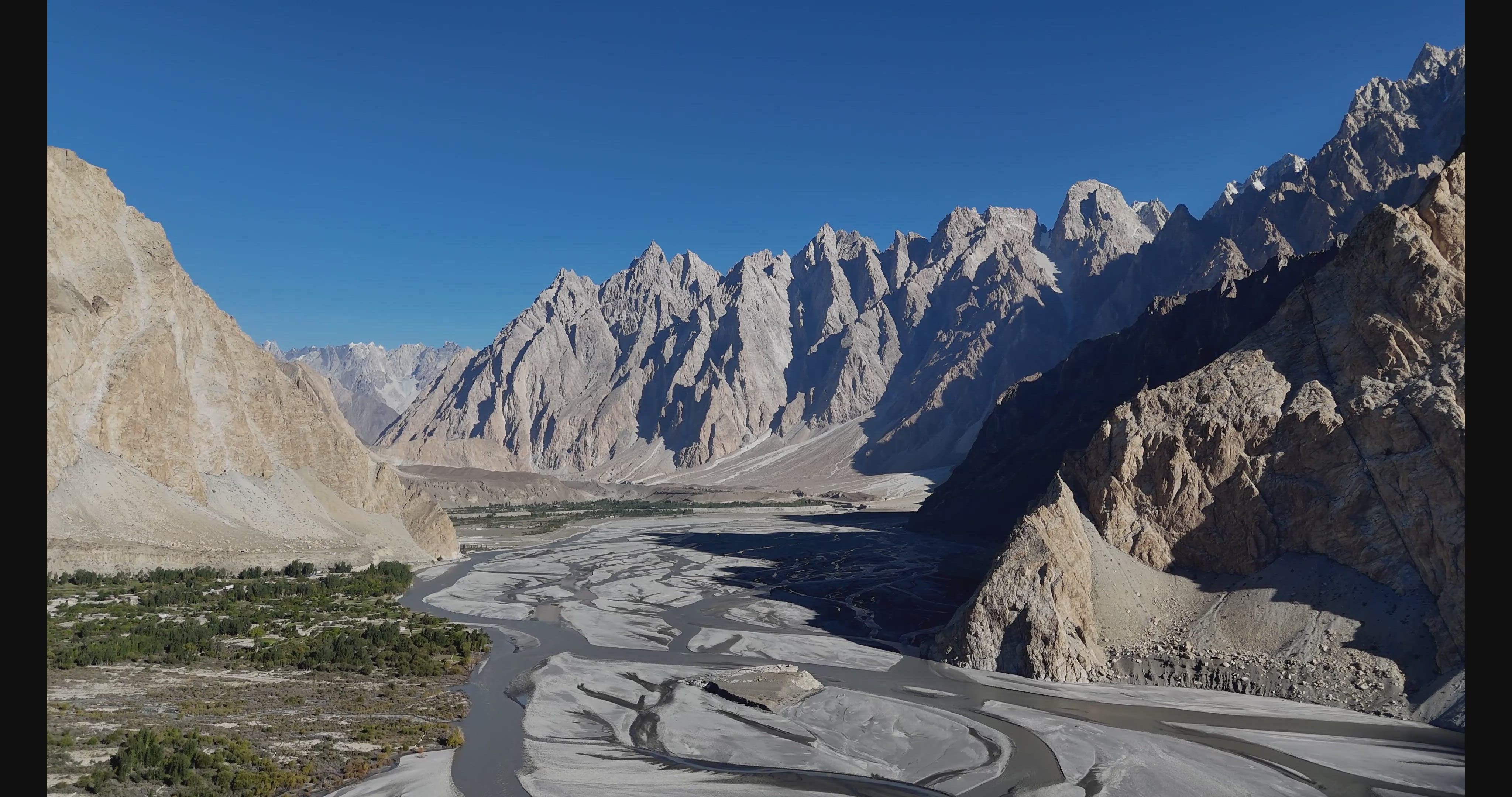 Take a tour of Pakistan's mountainous Gilgit Baltistan territory in this drone video by top contributor nayyar2006. The video was mostly filmed from the Karakorum Highway, which runs roughly north from the Punjab province through GB and to the border with China. You'll see the three great mountain ranges which converge here - the Himalaya, Karakorum, and Hindu Kush. Specific featured locations include Attabad Lake (at the 1:15 mark), Mt. Tupopdan (aka Passu Cones) (1:47), Hopar Glacier and Valley (2:16), and Passu Glacier (3:50).