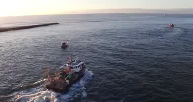Montage of aerial video clips of various boats setting out to sea from Shinnecock Inlet, Hampton Bays, NY, and shots of the ocean beach, stone jetty, and commercial fishing dock.