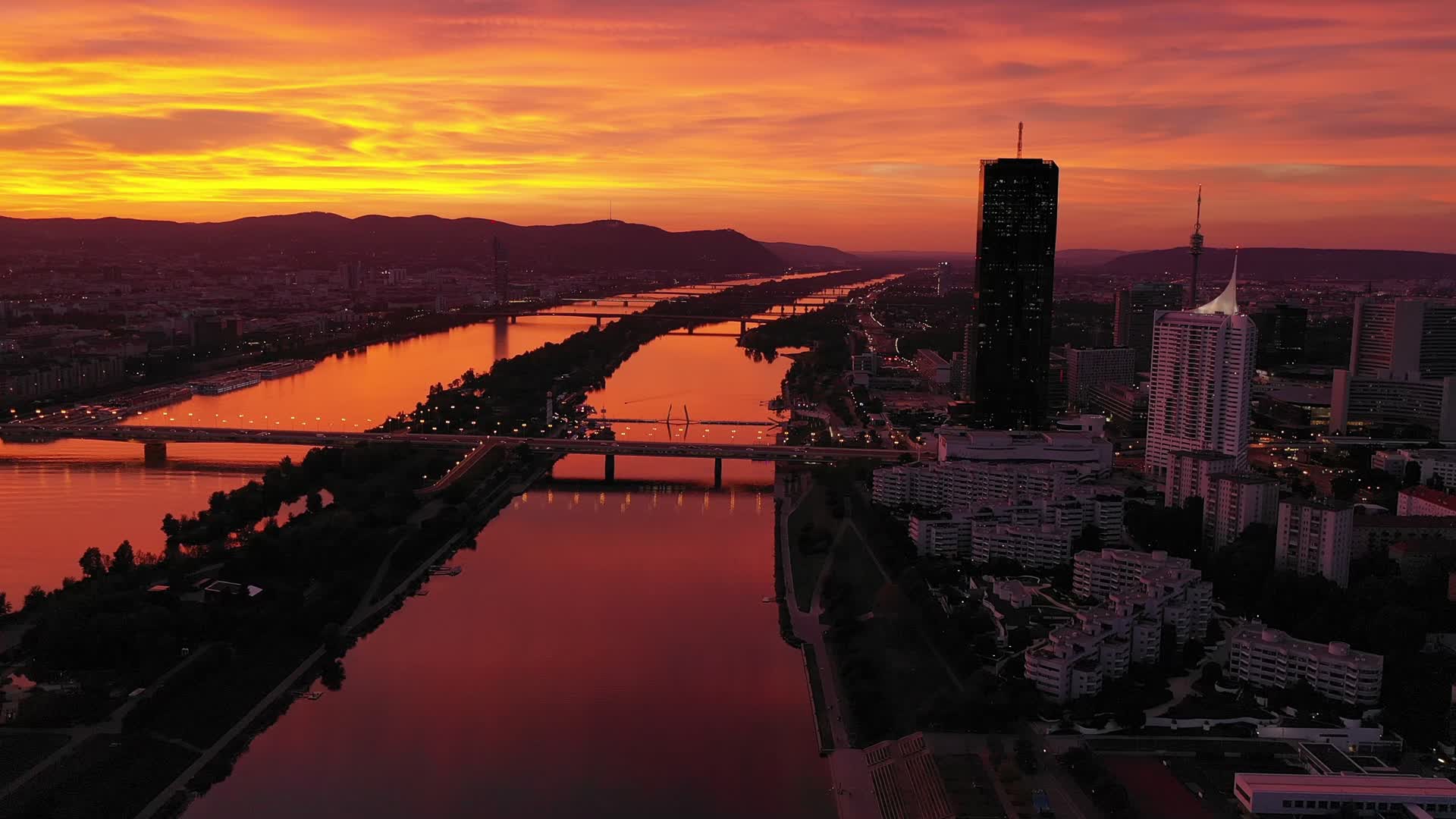 Taken in these marvelous sunset drone views of the most modern district in Vienna, Austria, compliments of W.Obereder. The area filmed is called Donau City (abbreviated as DC), and it's part of the city's 22nd district. It's situated on the eastern bank of the Danube, a bit downstream from the historical city center. Its centerpiece is DC Tower 1, the tall black building which features prominently in the video. Completed in 2013, the 60-story tower stands 220 meters (720 ft.) and is Austria's tallest building as of 2020.