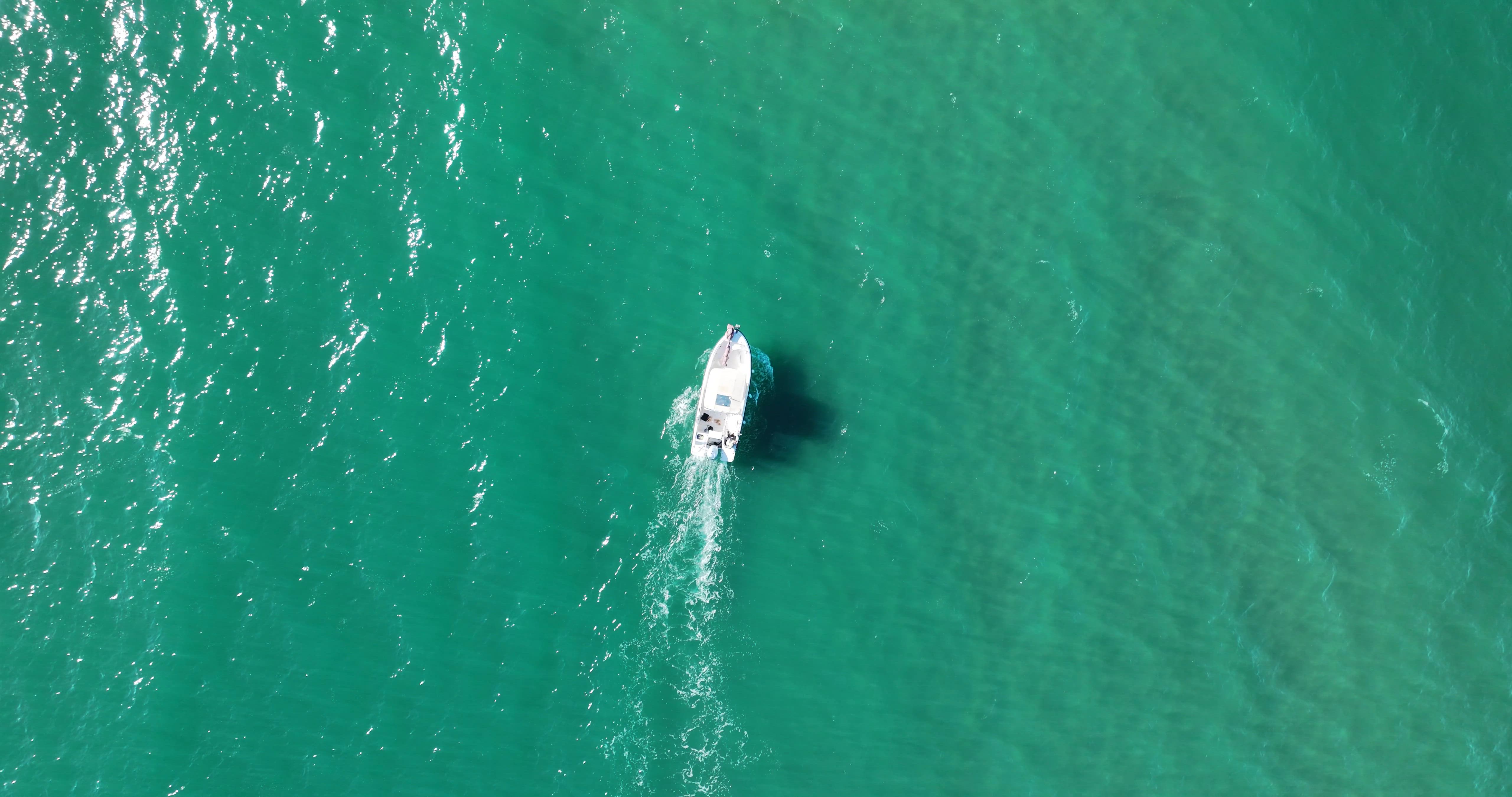 A top-down drone shot of a boat cutting through bright green, sunlit Mediterranean waters, with a shimmering trail behind.
