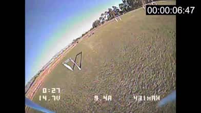 Here's my DVR footage to correlate with data from the TBS Race Tracker. This wasn't my cleanest run of the day, but it had my fastest lap of 7.600s. I got this time twice with 5046x3 cyclones and DYS Storm motors. I also got 7.7-8s consistently with 5045x2BN Dal props. I found the dual blades were easier to enter hairpins at low-mid RPM compared to the cyclones, but the cyclones were faster and had more acceleration punching out of corners.