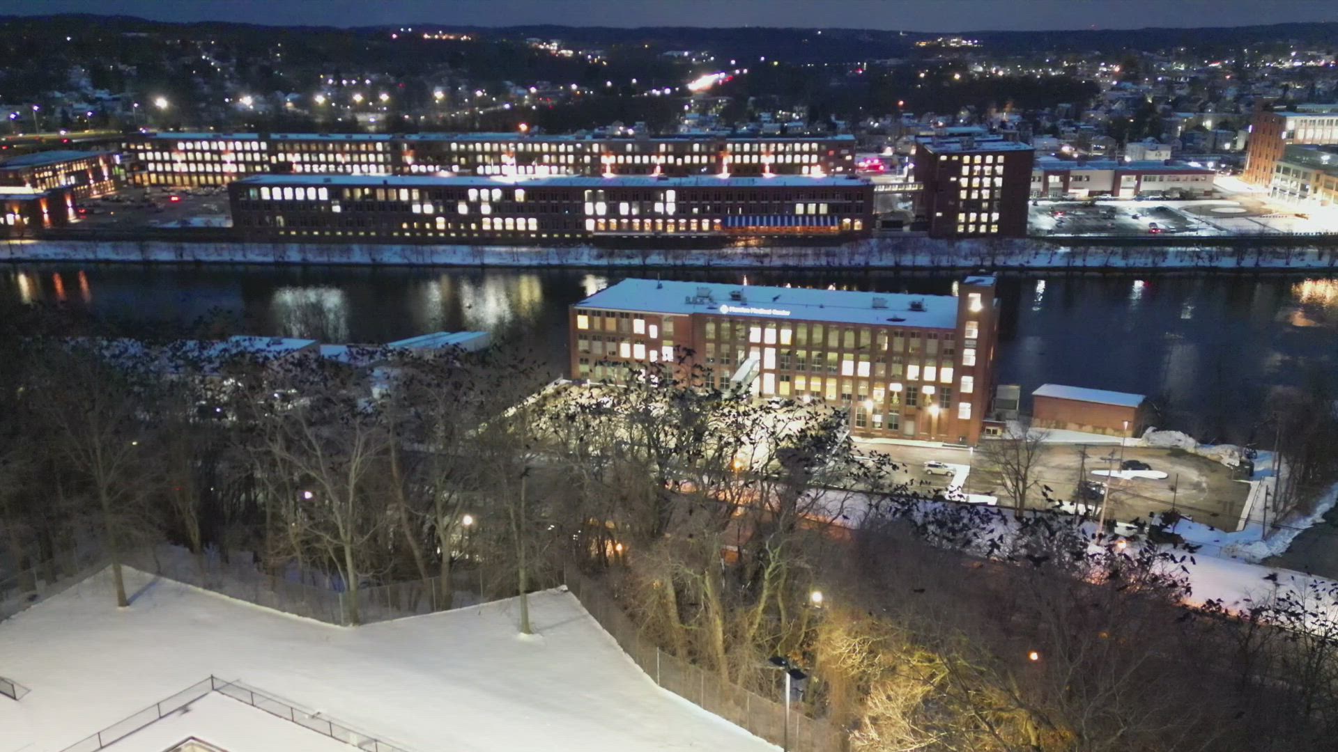 This video provides aerial views around a Winter Crow Roost located north of Boston. After a full day out on foraging grounds in smaller groups, both American and Fish Crows stream in flight back to nearby staging areas, and then they converge into the overnight communal roost trees on a hillside, typically between 20 and 40 minutes after sunset time. The roost is located in a busy city next to a hospital and near a major highway, and with plenty of background ambient lighting. It is an amazing phenomenon of nature and takes place in cities across the northern US and southern Canada during the colder winter months. The Crows are known as very smart, social, and family centered.