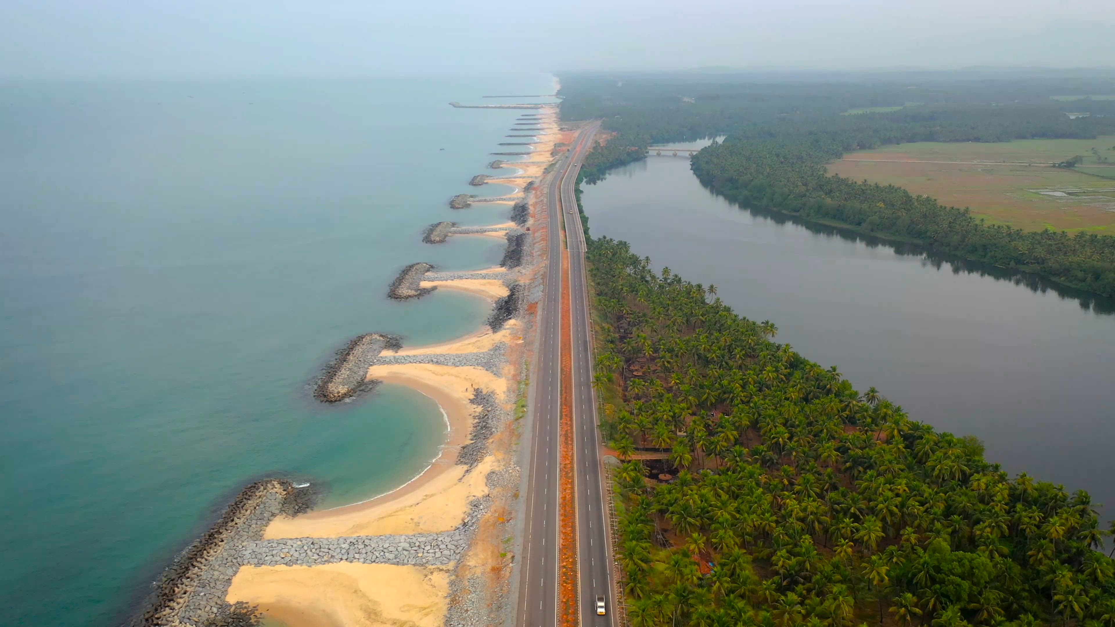 Aerial visuals of Maravanthe beach - a very picturesque stretch near Udupi, Karnataka, India. The beach has the Arabian sea on one side and the Souparnika river on the other. To avoid erosion, wave breakers have been constructed along the beach, which give it a dramatic look from the air.