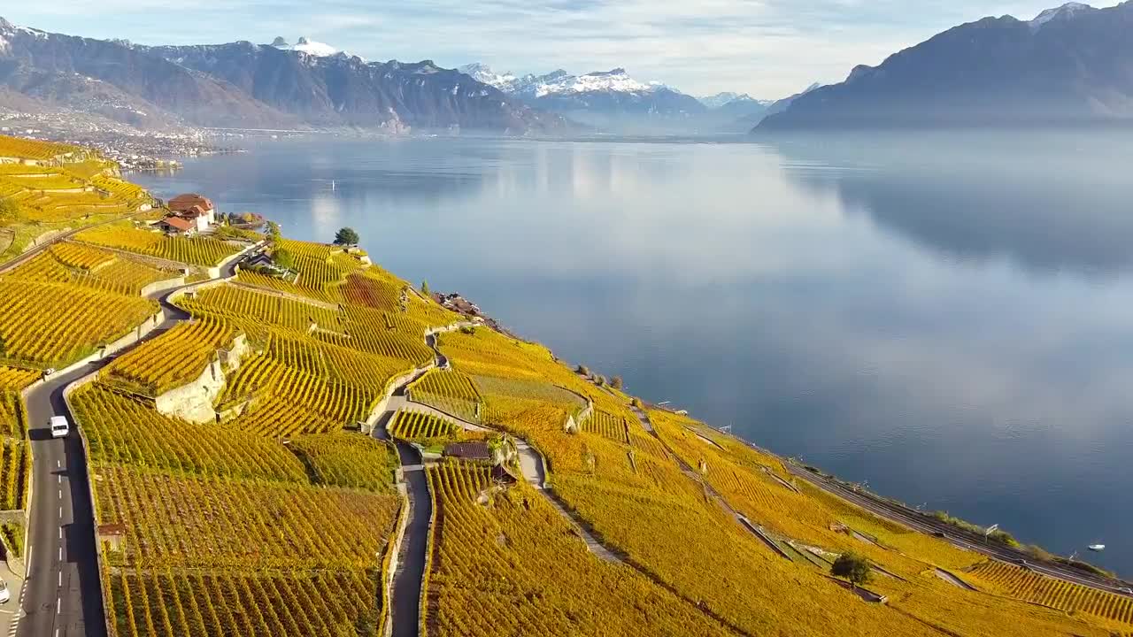 Magnifique lac Léman. Survol du "lavaux" près Vevey et de Montreux